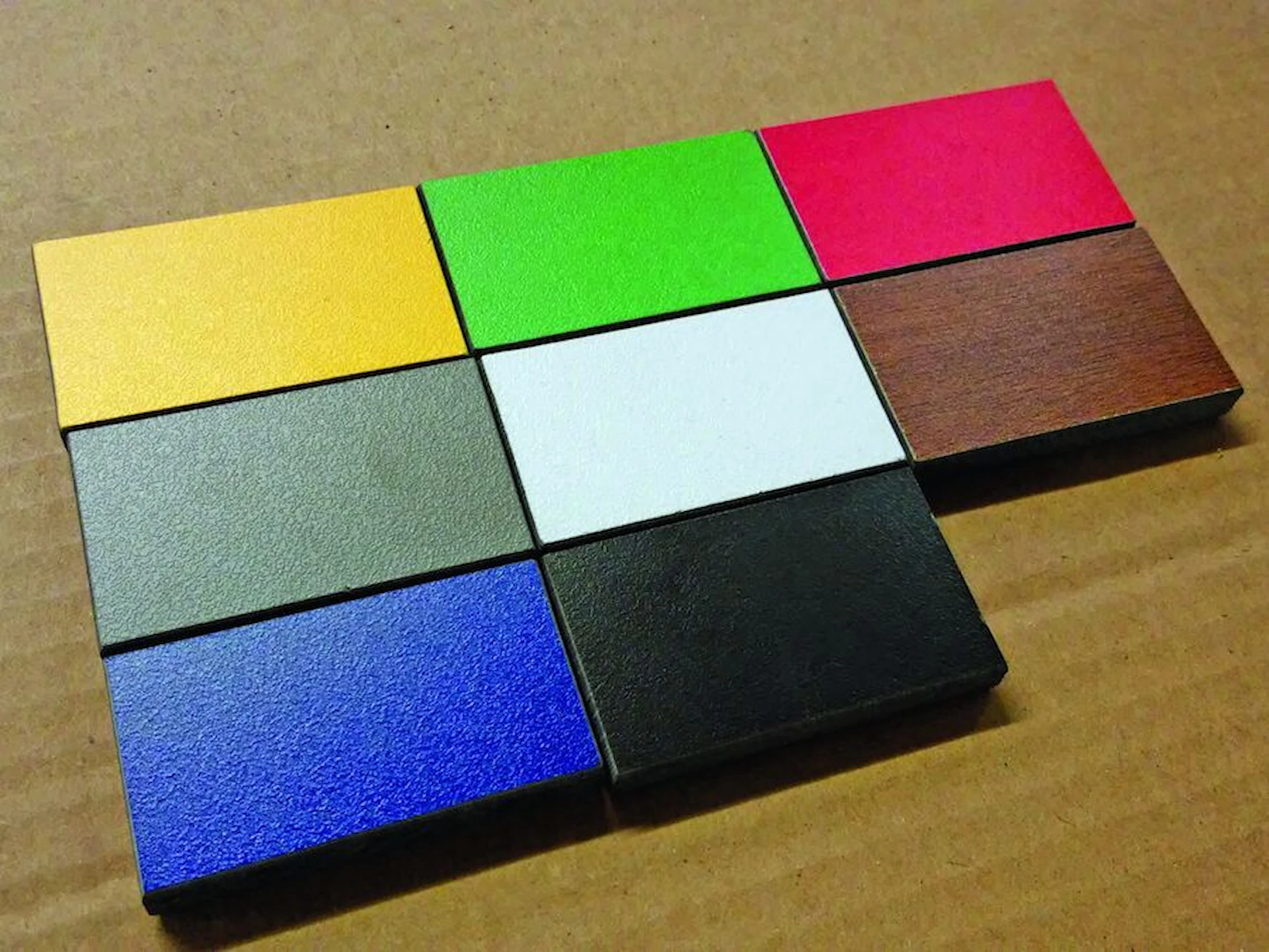 Vælg mellem otte forskellige farver: Sort, grøn, træfarvet, gul, rød, blå, hvid og grå.