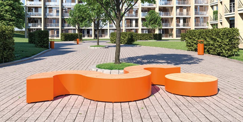 Kombinér og leg med form og farve med DELPHINUS-familiens modulære system. DELPHINUS opfordrer virkelig til socialt samvær i parker og bymiljøet, fordi både de store podier samt halv- og kvartcirklernes kombinationsmuligheder gør, at mange kan sidde sammen. På den måde bliver det en inkluderende serie. De ubrudte overflader sætter heller ingen anvisninger på, hvem eller hvor mange der må sidde hvor; her er frit spil i byrummet.