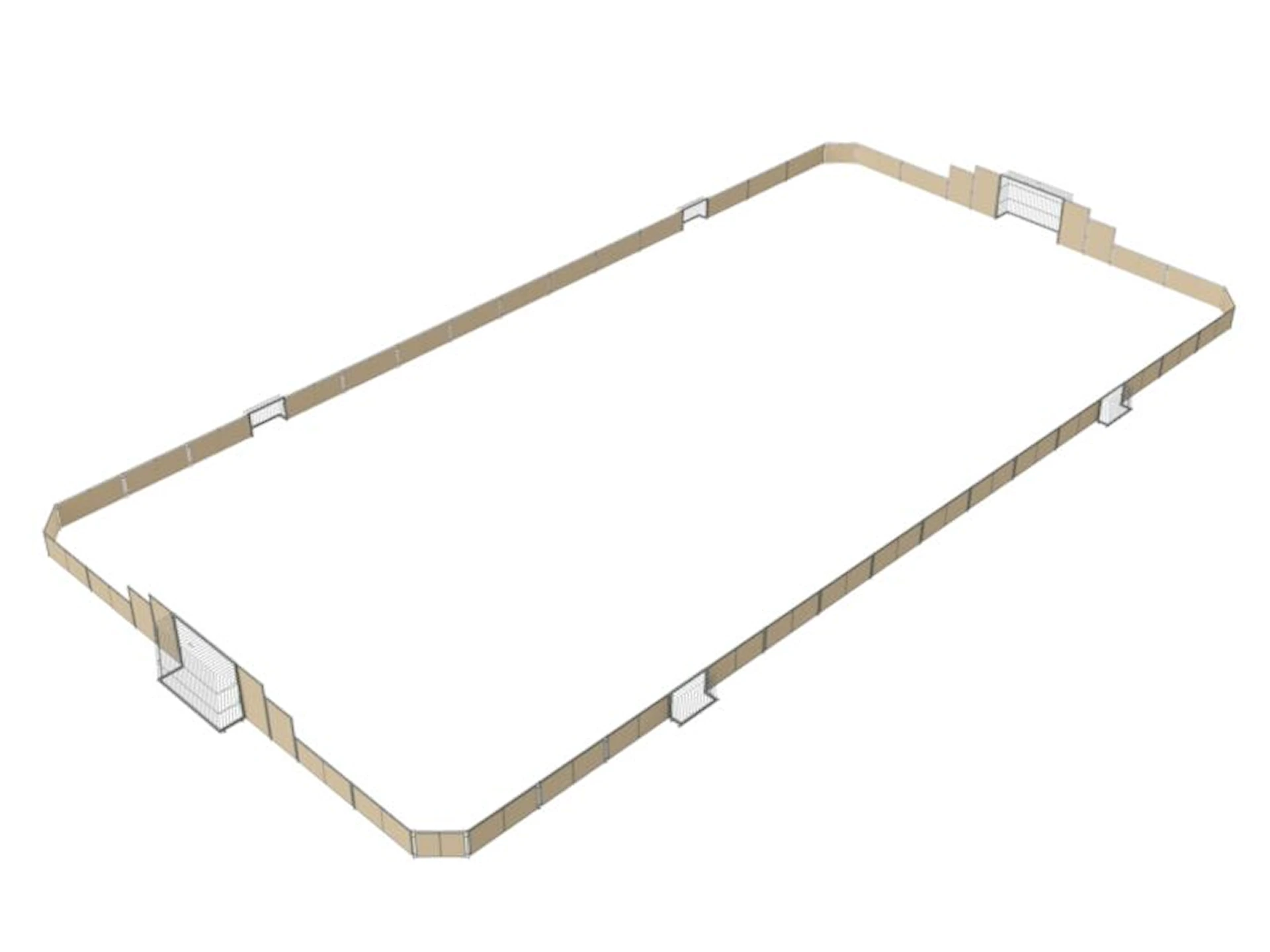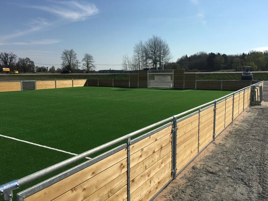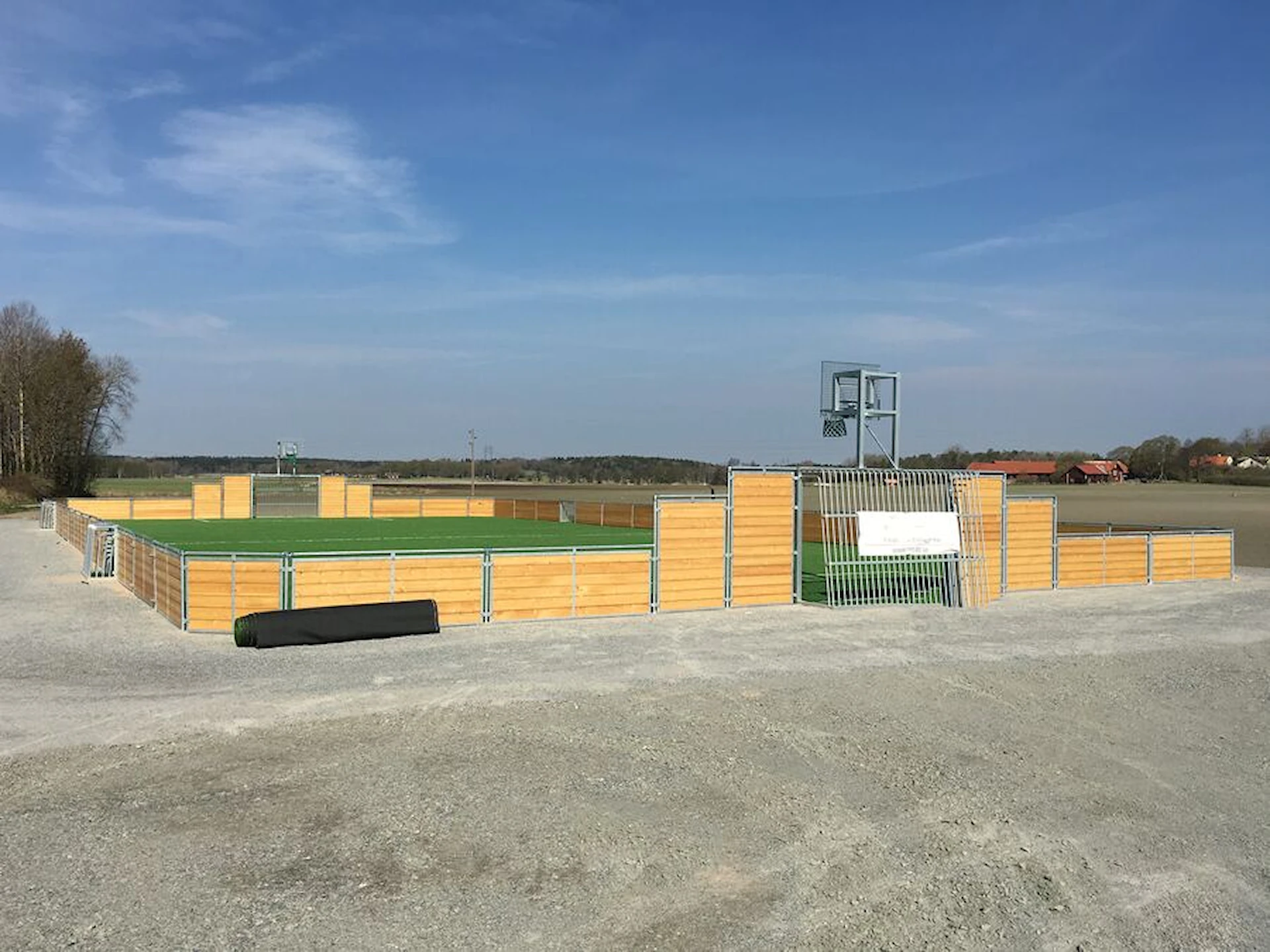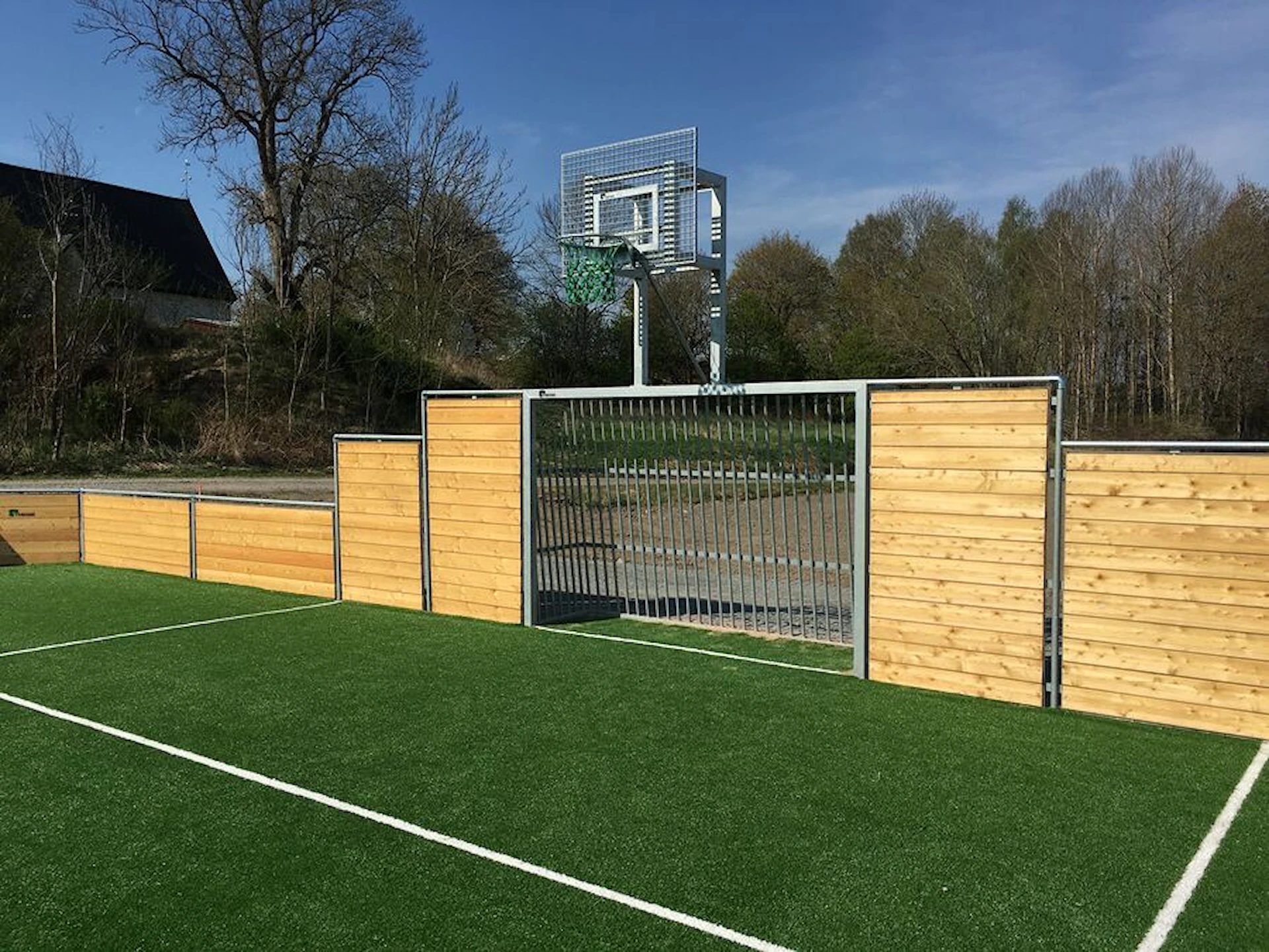 Toprør på baneender og langsider samt skråtstillede hjørnebander sikrer et velafgrænset spilområde. Et sidemodul fungerer som servicelåge, og målene er forberedt til eftermontering af basketmodul.