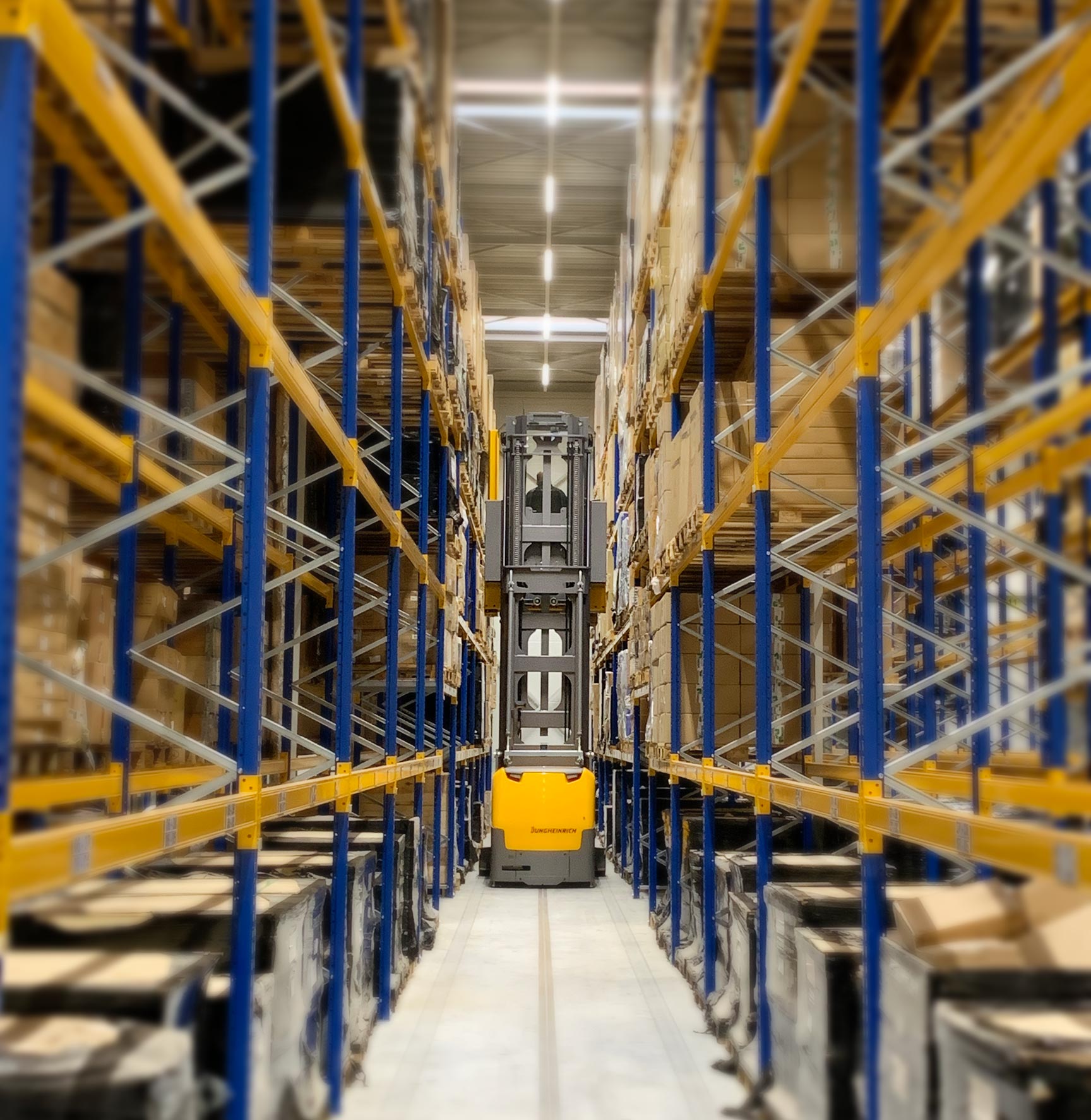 Den nye hal har plads til ca. 2000 paller og er indrettet som et højt smalgangslager, hvor en operatørbetjent smalgangstruck ved hjælp af induktionsstyring kører helt præcist i gangene.