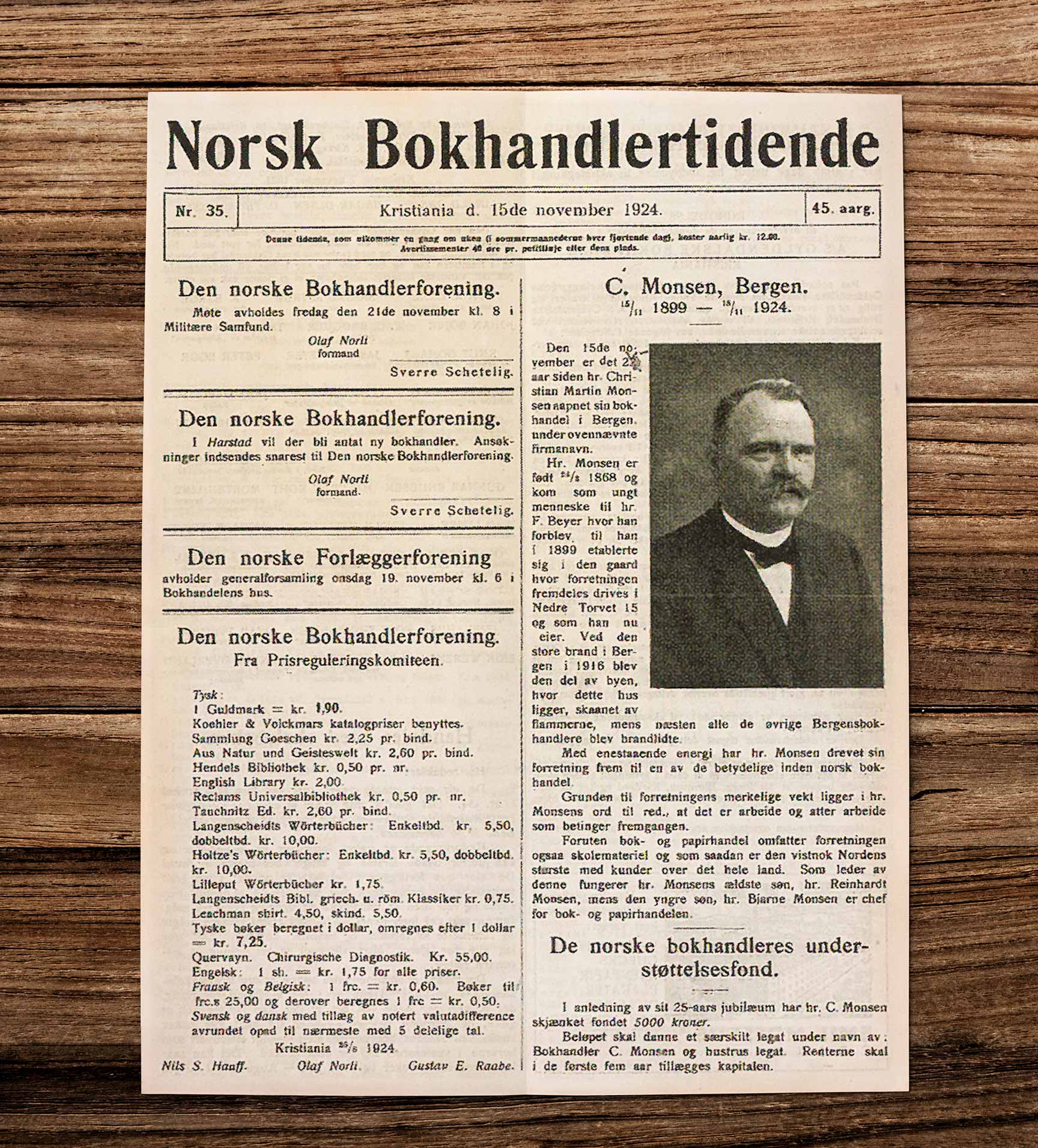 15. november 1924 markerer 25 års jubilæet for Christen Monsens boghandlervirksomhed.