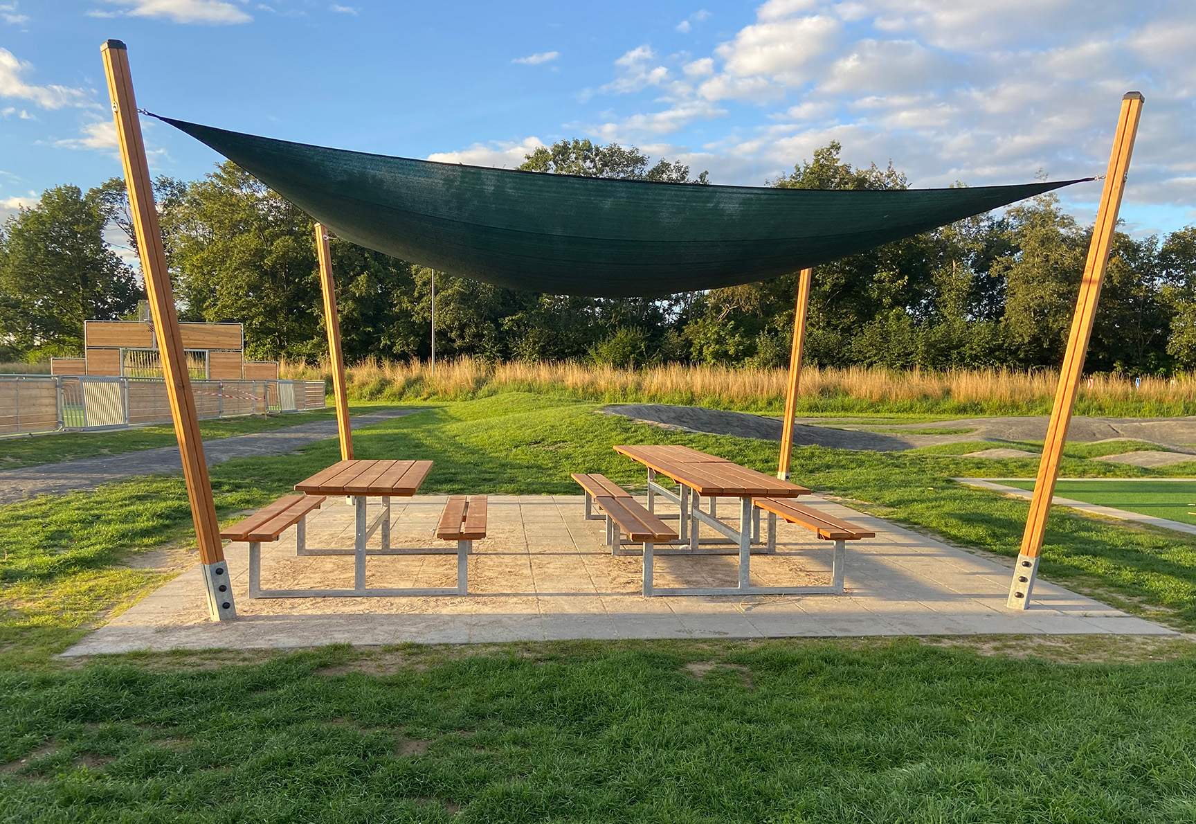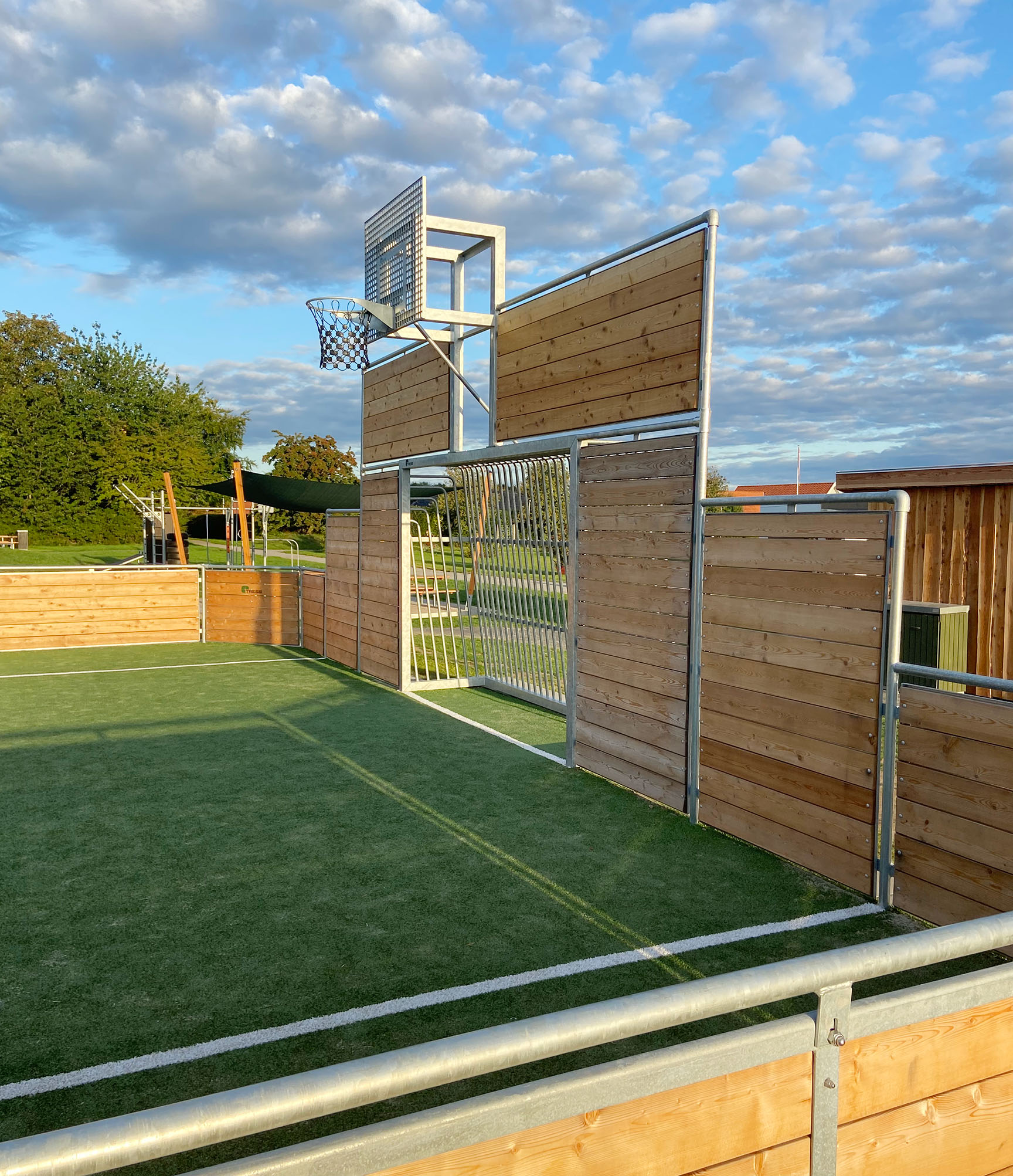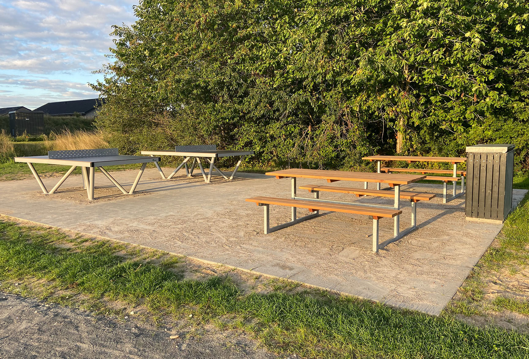 Aktivitetsområdet er inddelt i flere sammenhængende zoner – en multibane til diverse boldspil, et område til udendørs træning, et centreret opholdsområde med mange siddepladser under solsejl og et område med udendørs bordtennis.