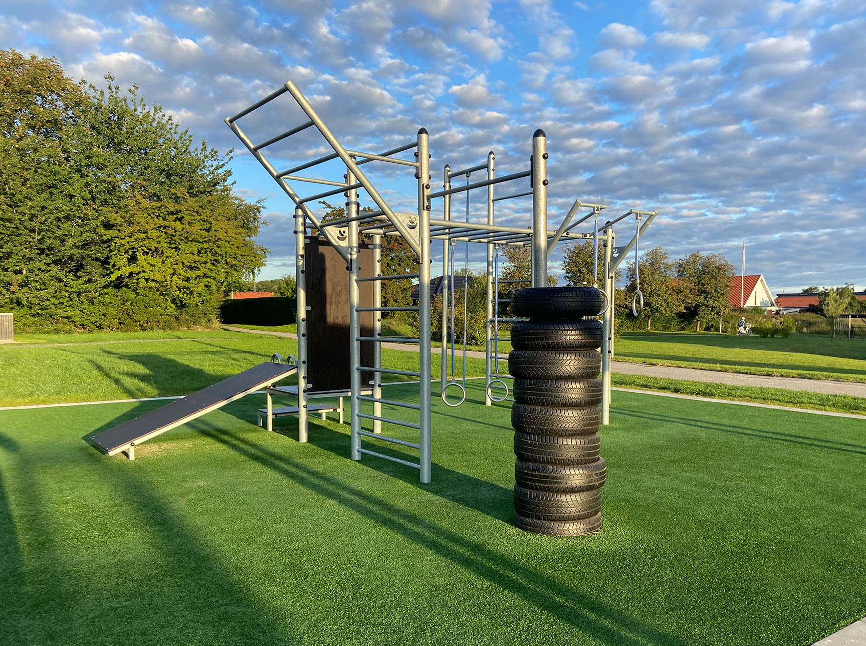 Ved Romalt Aktivitetshal har man nu fået et udendørs aktivitetsområde med plads til både leg og bevægelse samt med mange opholdspladser fordelt i området.
