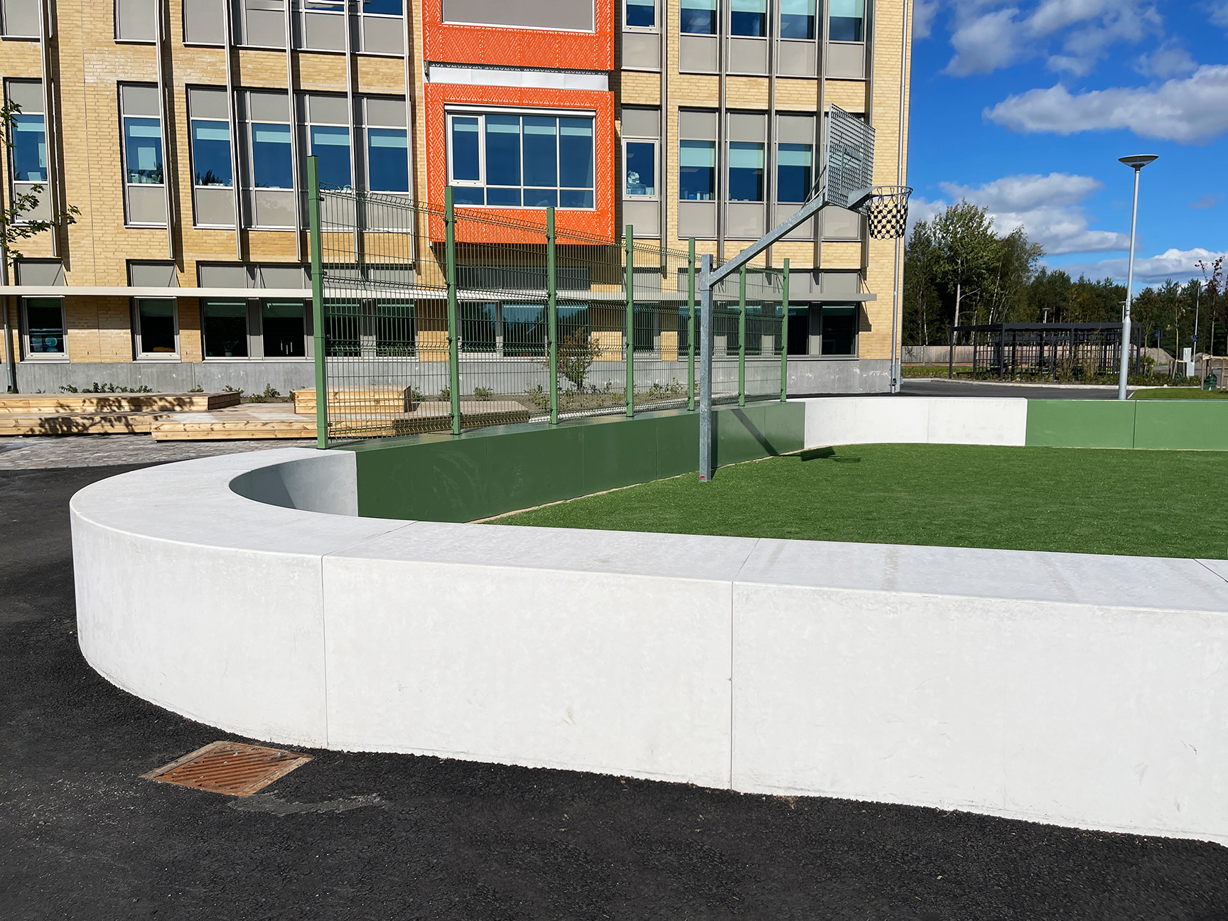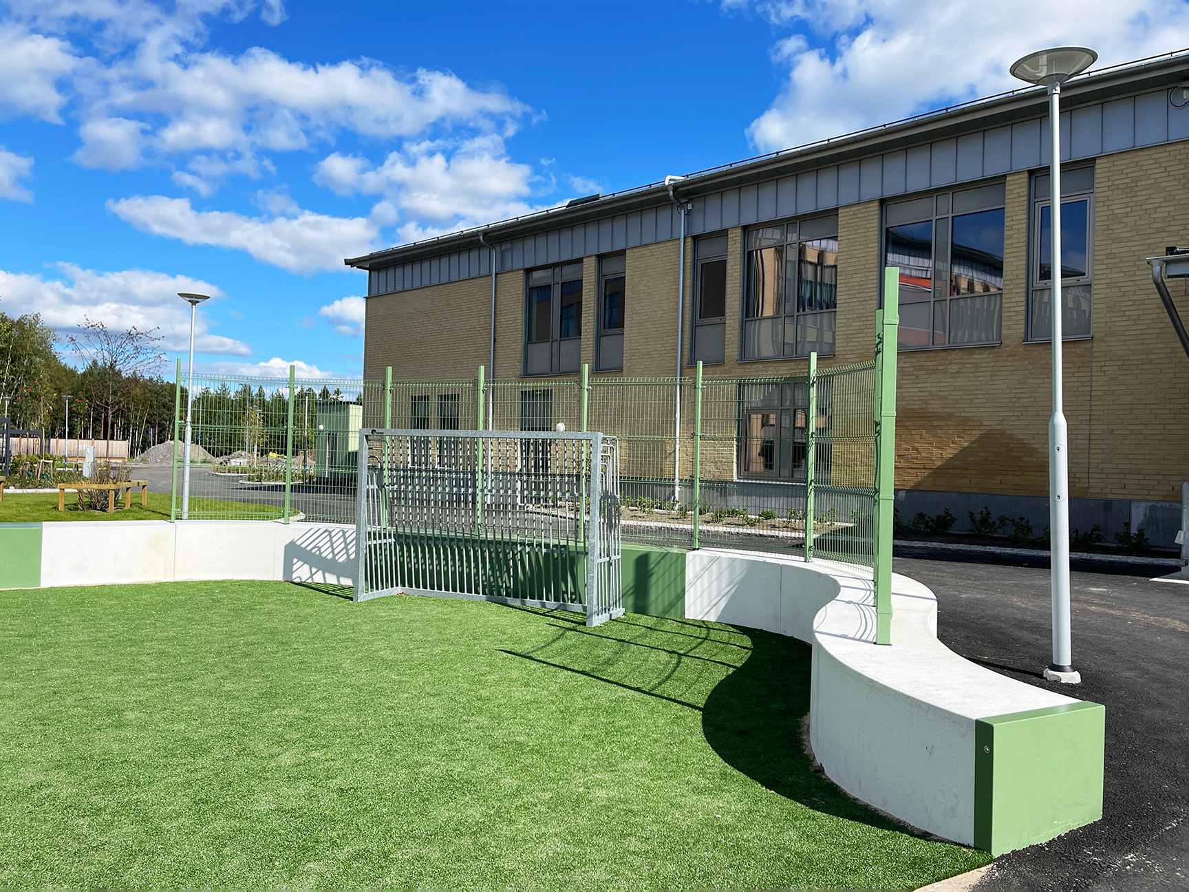 Den nybyggede Carlslundsskole i Umeå huser elever fra 7.-9. klasse og indretningen af skolegården skulle selvfølgelig matche aldersgruppen. Her findes derfor bl.a. en InsideOut multiarena, et parkourstativ, den store Boulder Rocks klatresten og udendørs bordtennisborde. Alt stål er pulverlakeret i den flotte RAL-farve 6011 Reseda Green, som matcher skolegårdens omgivelser.