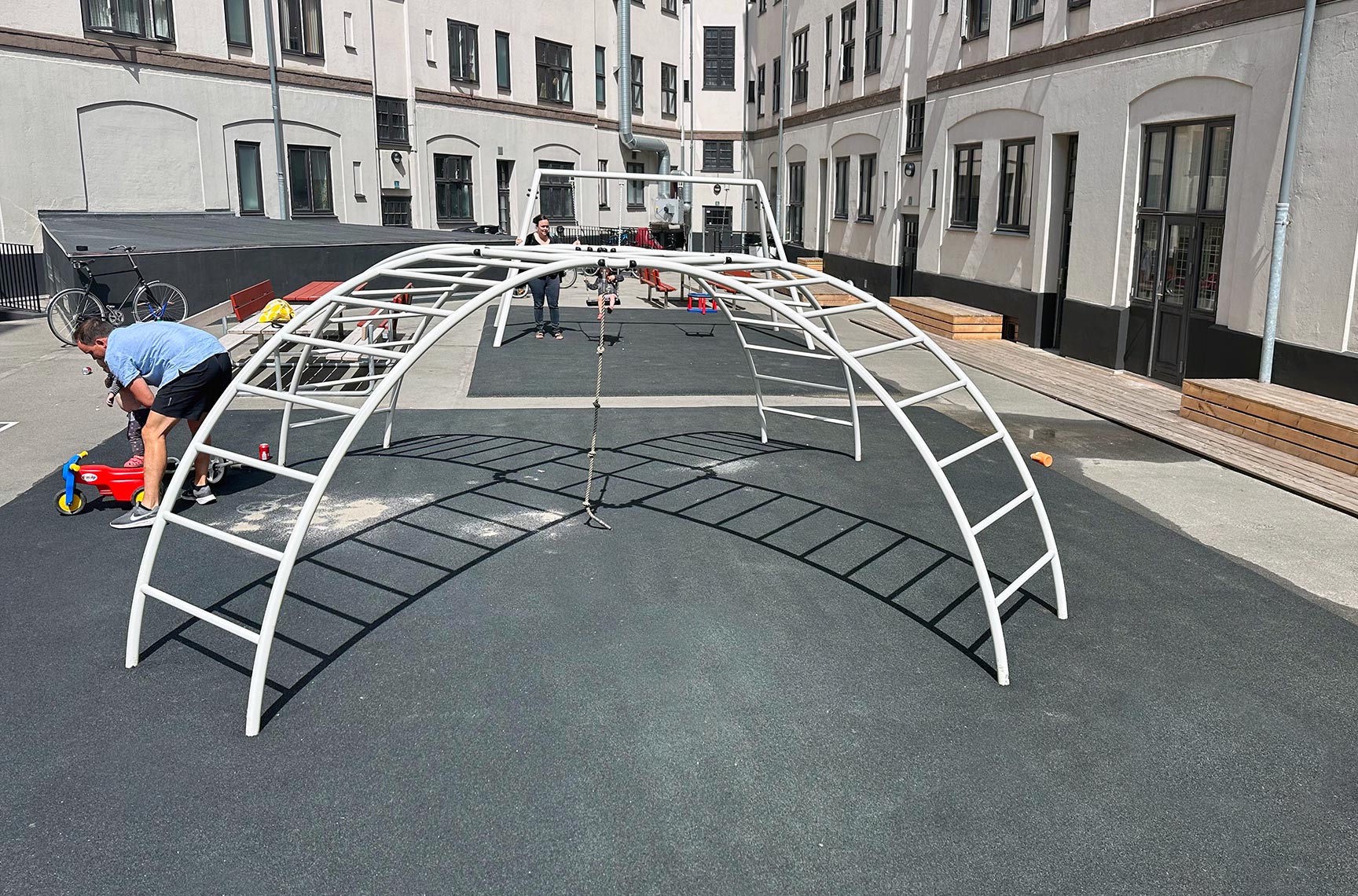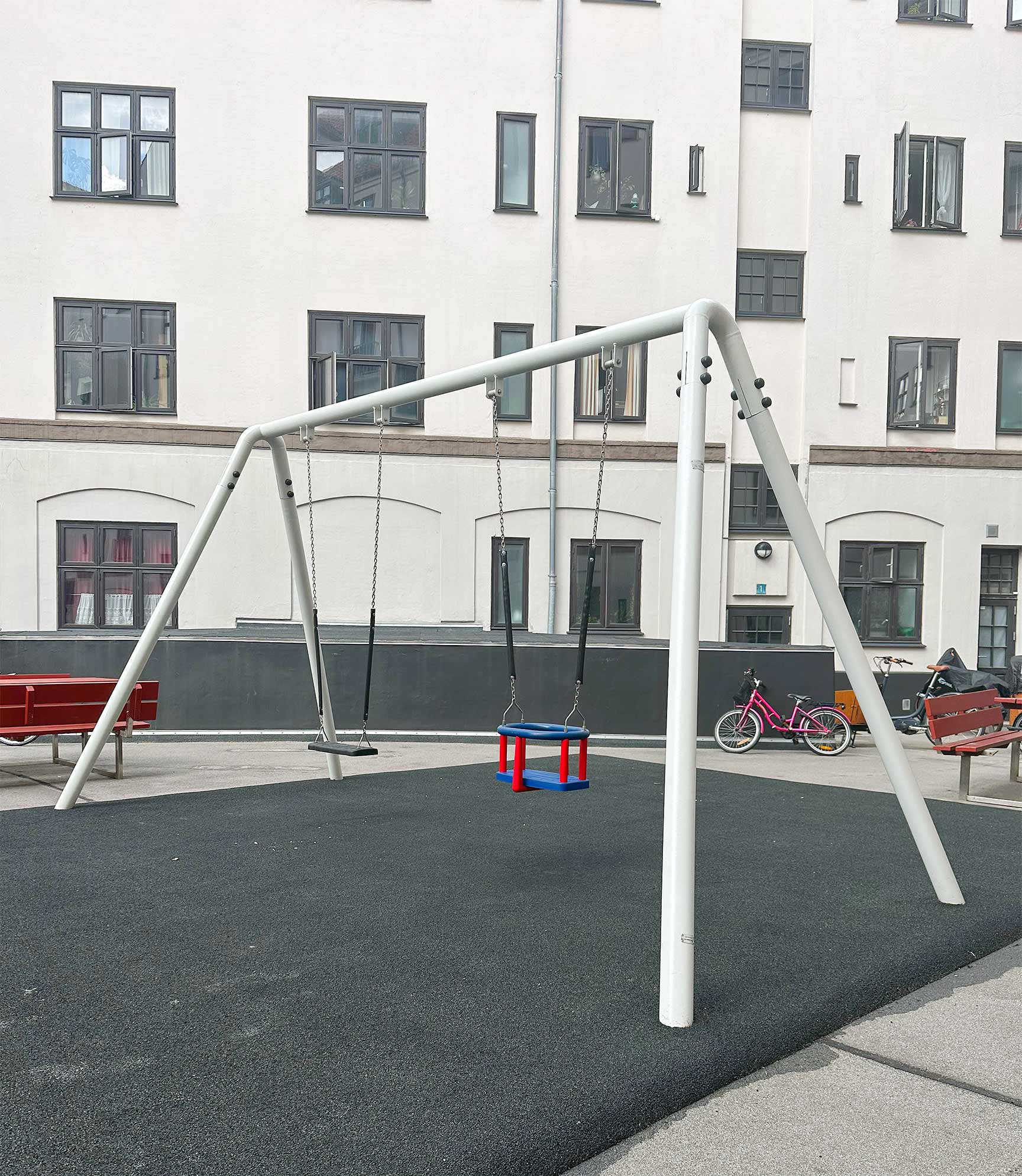 I forbindelse med en gennemgribende renovering af gårdrummet ved ejerforeningen AB Haabet på Amager i København har vi leveret udstyr til gårdens nye legeplads. Her kan de lidt større børn udfordre sig selv på klatrebuen og hoppe højt på trampolinerne, mens de mindre børn kan hygge i sandkassen og få en gyngetur.