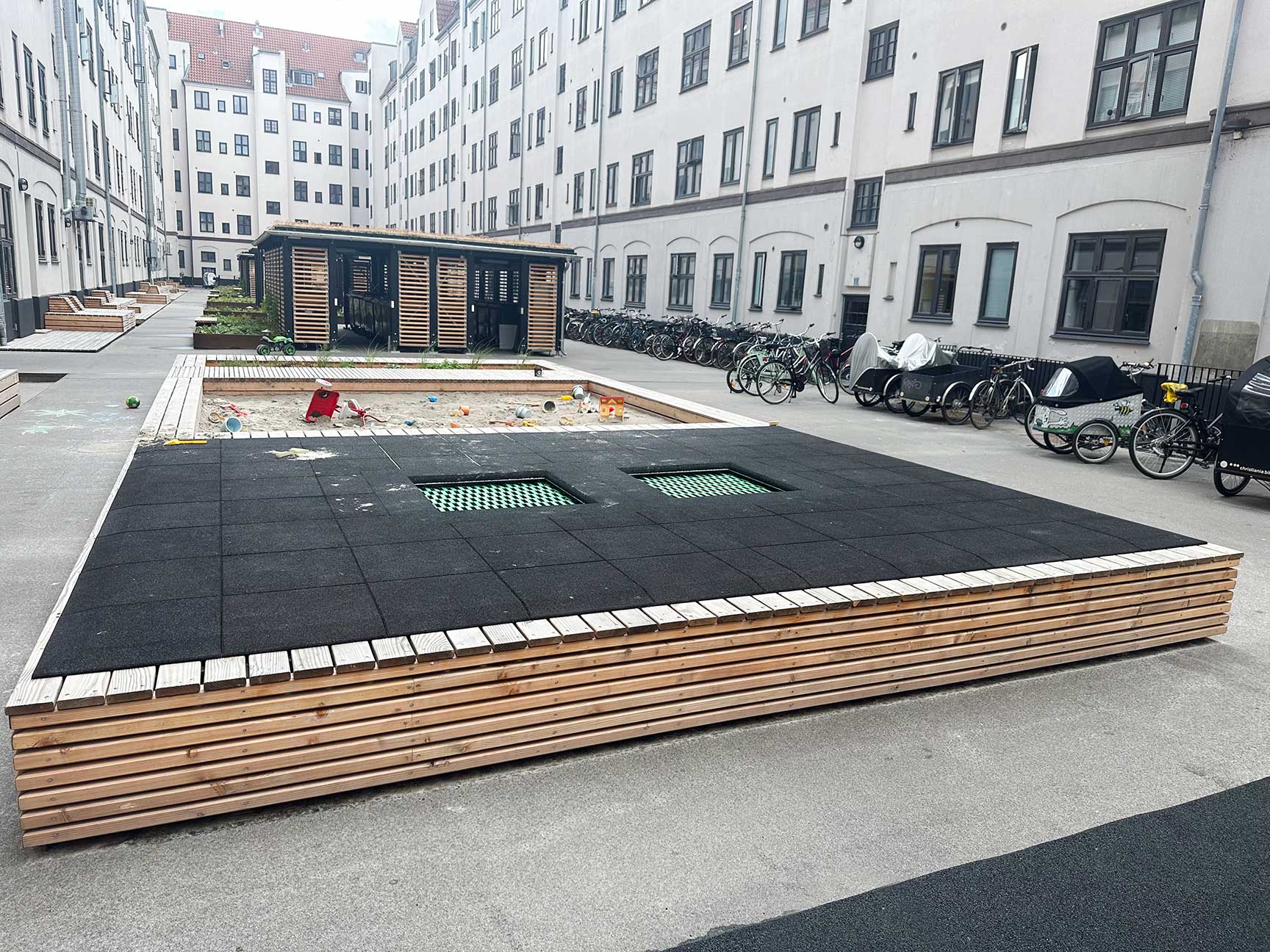 I forbindelse med renoveringen af gårdrummet blev opholdsrummet inddelt i forskellige zoner. Legearealerne blev placeret i gårdens nordlige og mest solrige del – flot omkranset af opholdsdæk i træ.