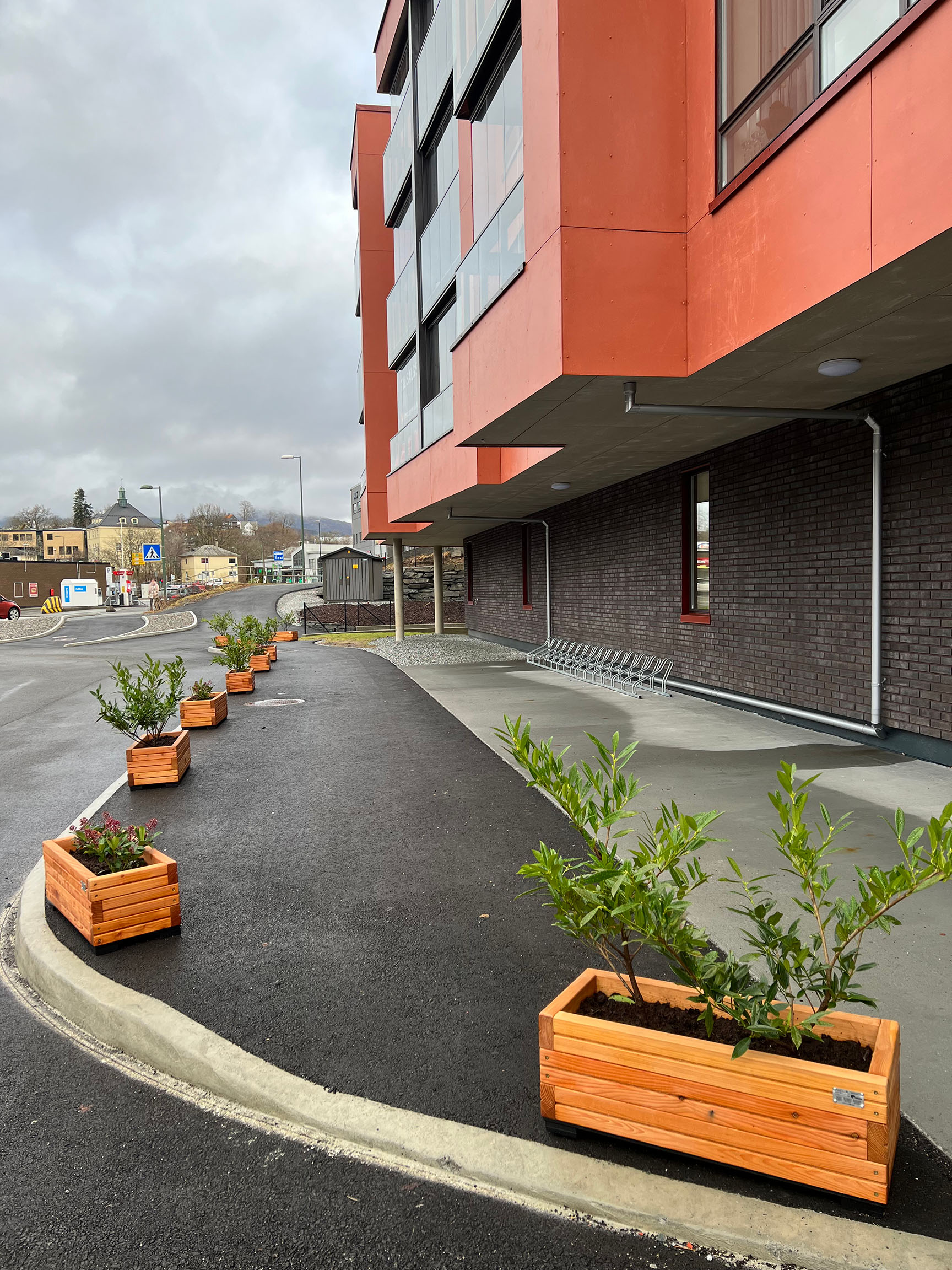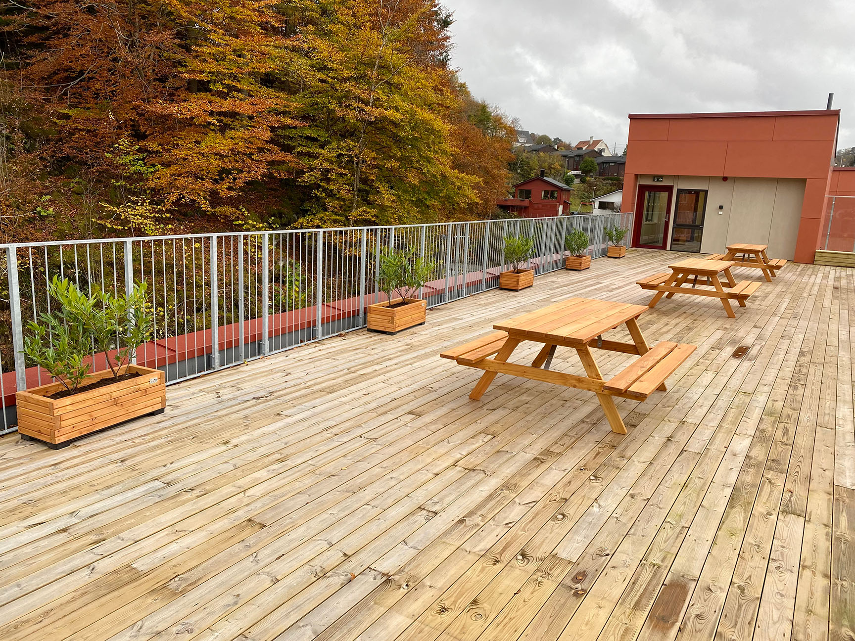 Her finder du fugleredegynge, sandkasse og klatrenet til stor glæde for de yngre beboere. Bænkeborde og blomsterkasser i lærk fastholder den røde tråd og giver en hyggelig ramme omkring boligområdet. Bænkebordene på tagterrassen gør det nemt at samles både store og små.