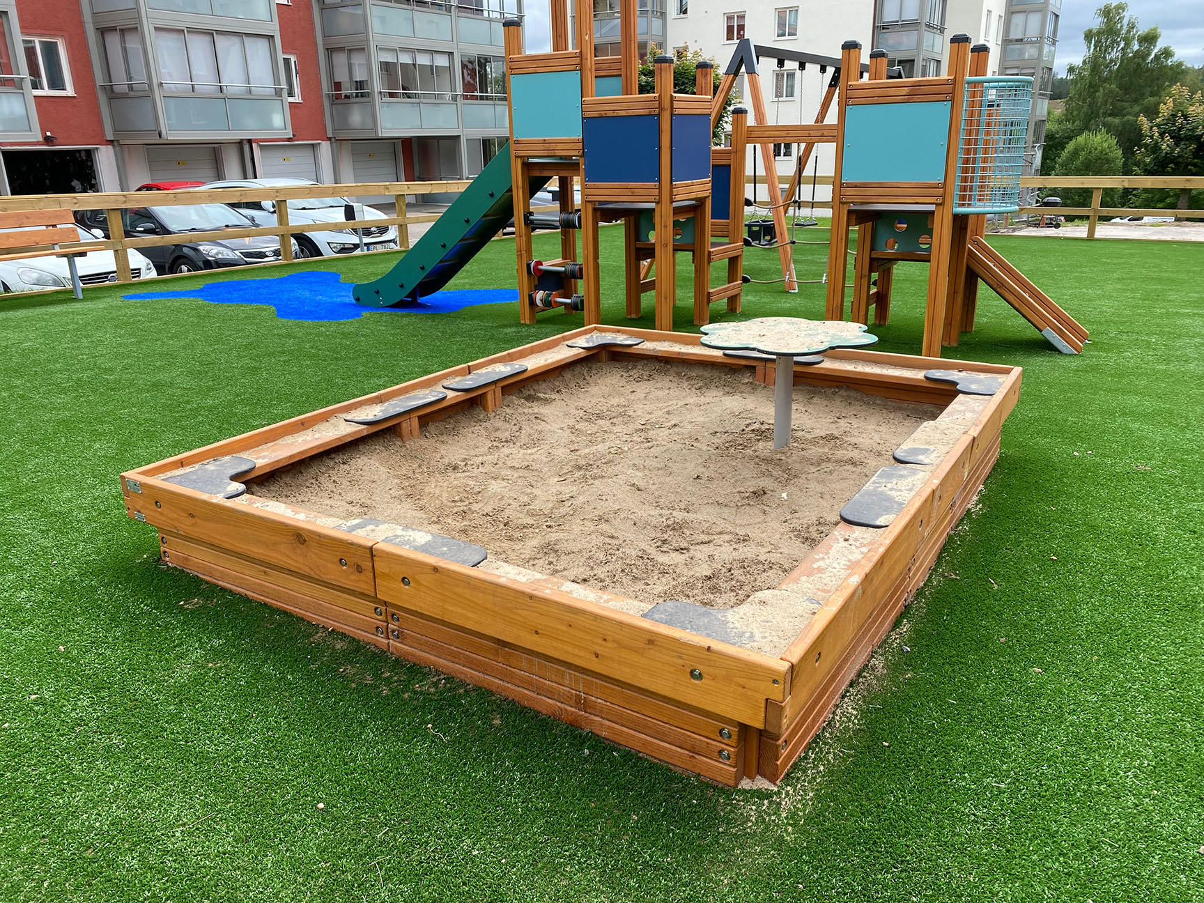 Legeudstyret falder smukt ind i omgivelserne med olieret lærketræ og detaljer i bløde blå nuancer. Sandkassen med sandbordet er designet til de yngste børn. Der er også udfordrende klatreleg med rutsjebane og naturligvis det populære gyngestativ med fugleredegynge til de lidt ældre børn.