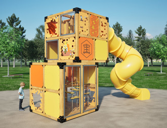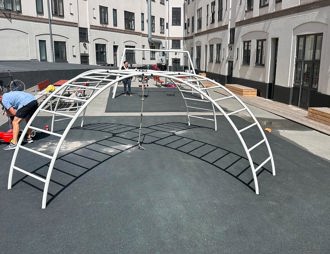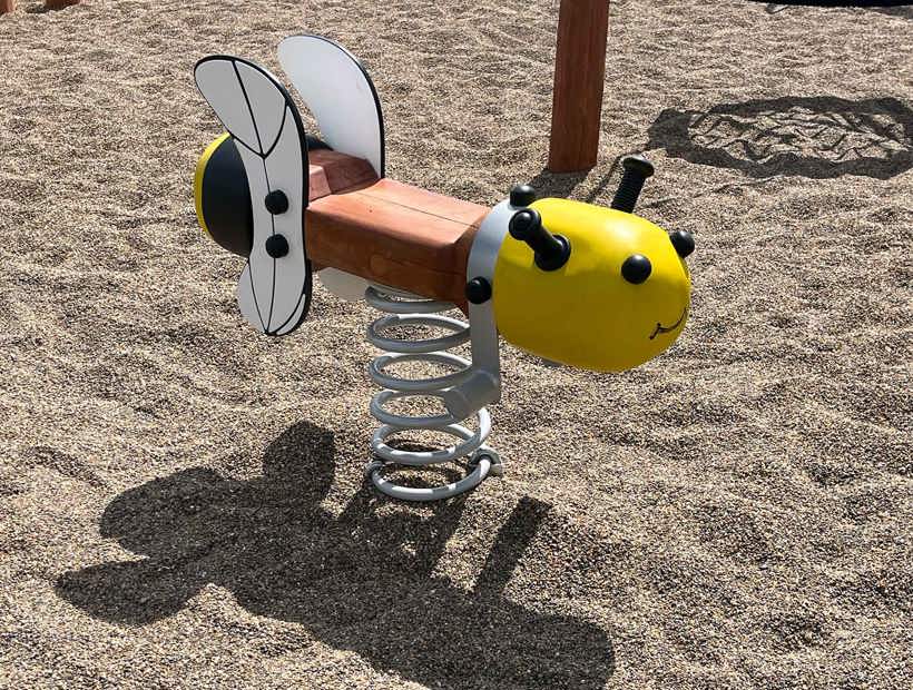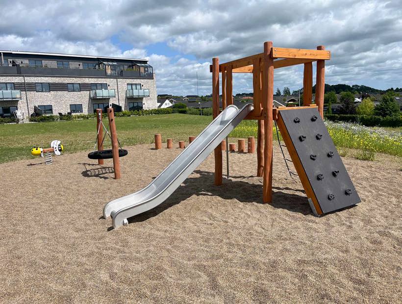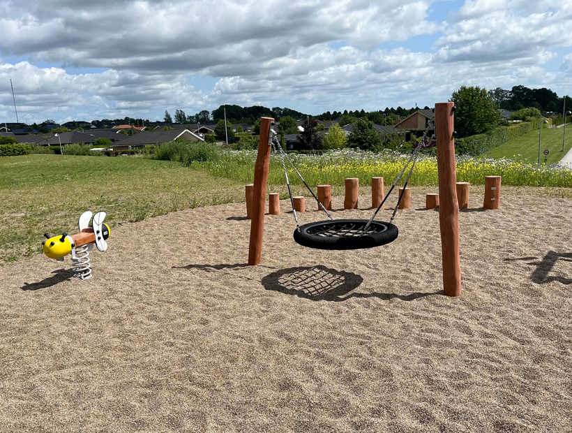 Alle legeredskaber er udført i robiniatræ. Det er et robust og smukt naturmateriale, der passer perfekt ind i de grønne omgivelser omkring boligområdet. Træets organiske udtryk passer elegant ind i beboerforeningens omkringliggende landskab, og det giver et flot helhedsindtryk af legepladsen.