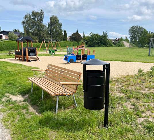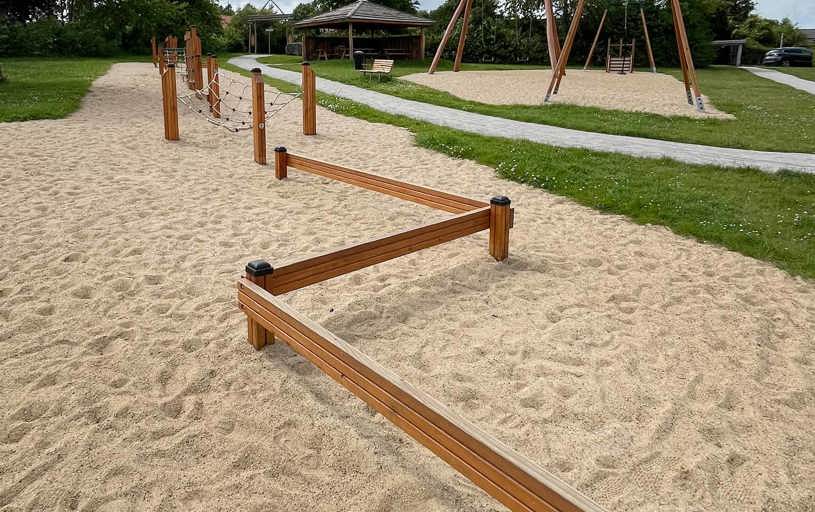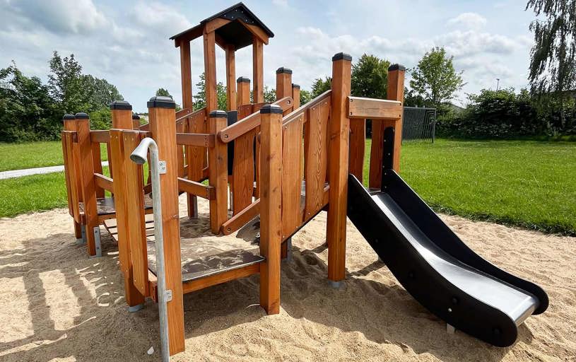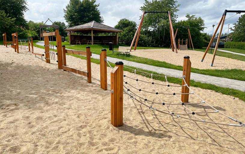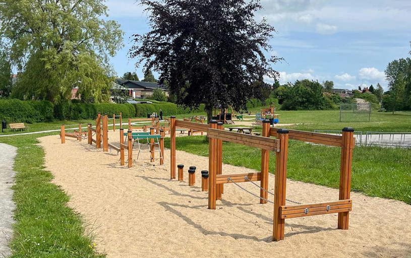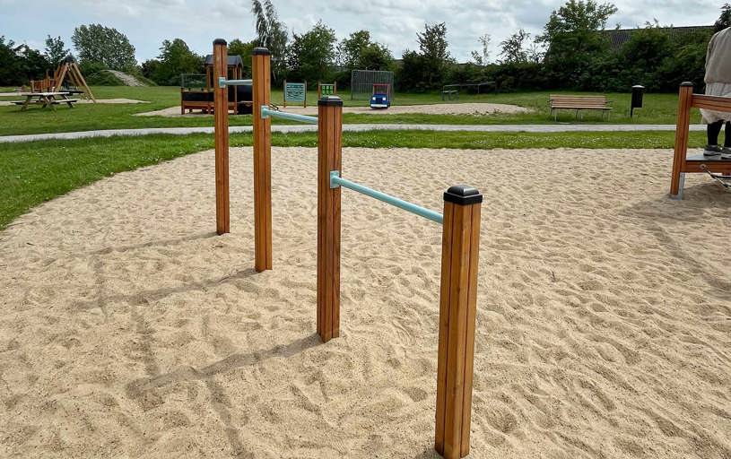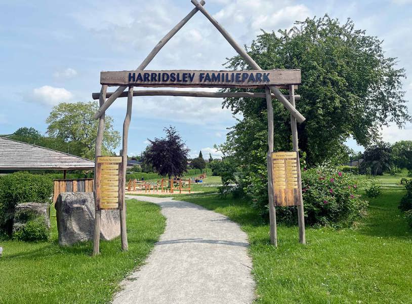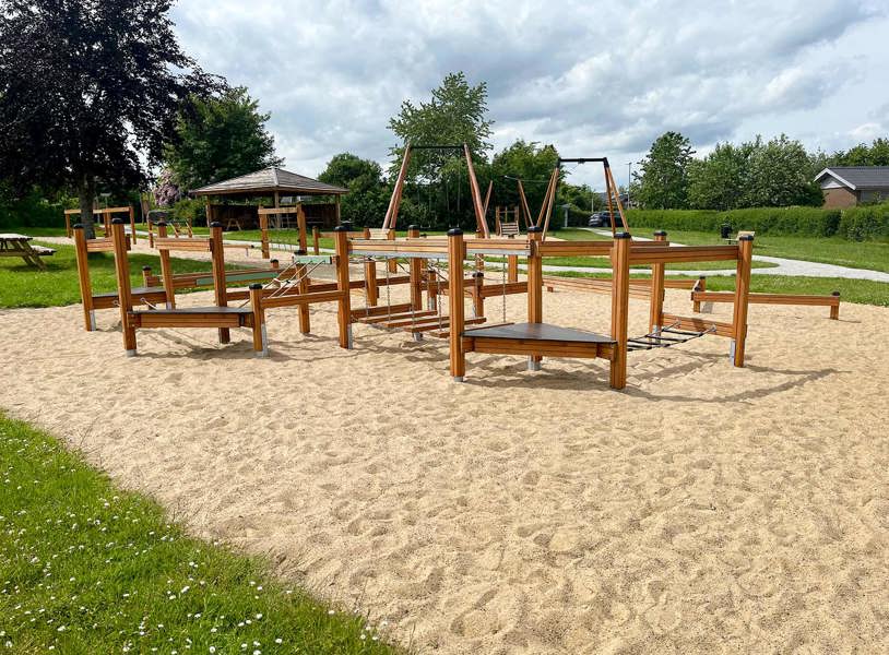 Familieparken i Harridslev skulle passe naturligt ind i omgivelserne, og derfor er alt udstyr fra forskellige serier med flot trælook. Det hele er robuste materialer som lærk og robinia, som giver en varm og indbydende stemning både i udtryk og kvalitet.