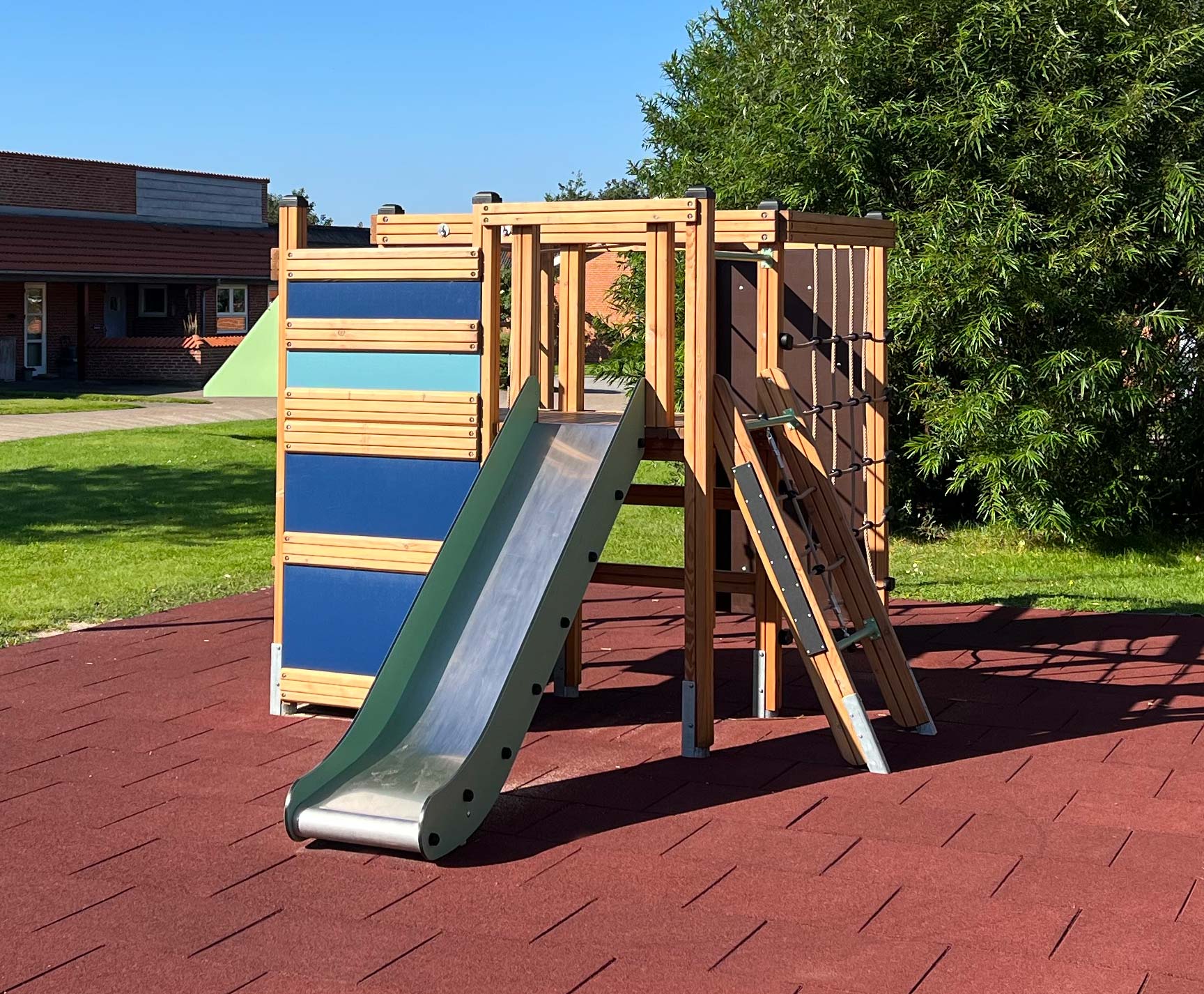 Faldsikring i gummifliser blev valg for at lave en vedligeholdelsesfri belægning. Det sikrer samtidig børnene ved fald på legeplads.