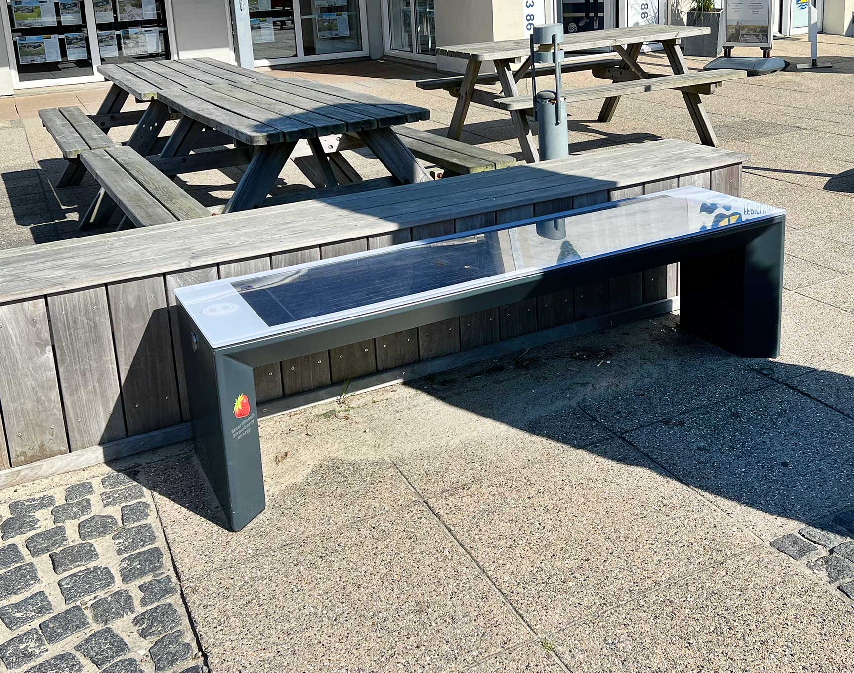 Ved legepladsen og andre steder i byen står i alt tre såkaldte SmartBench fra Strawberry Energy, som TRESS er eneste forhandler af i Danmark.