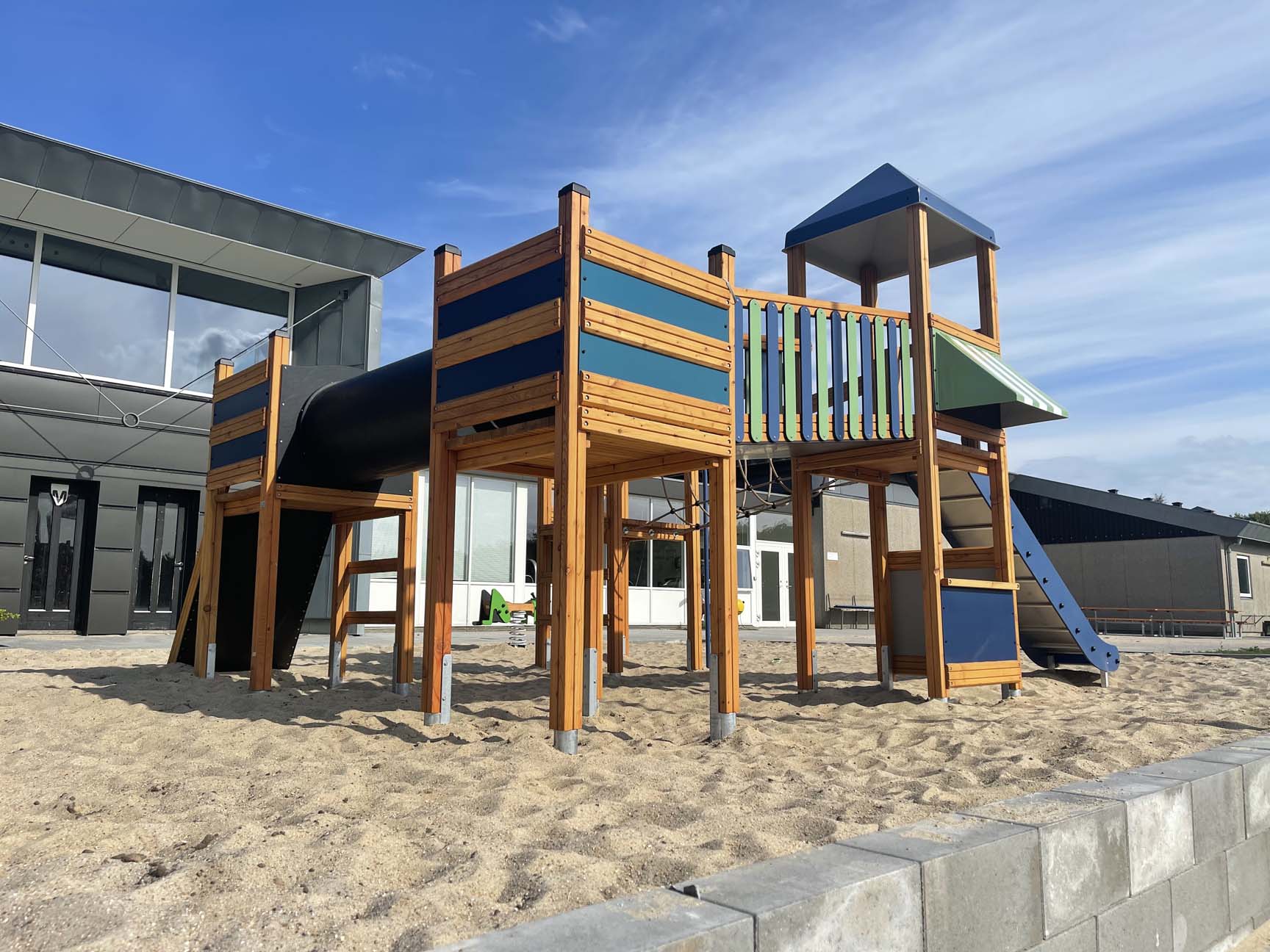 Legepladsen er valgt i naturlige materialer, så den passer ind i det grønne miljø omkring boldbanerne. Materialerne kræver desuden minimal vedligeholdelse, hvilket også var et vigtigt parameter for kunden.