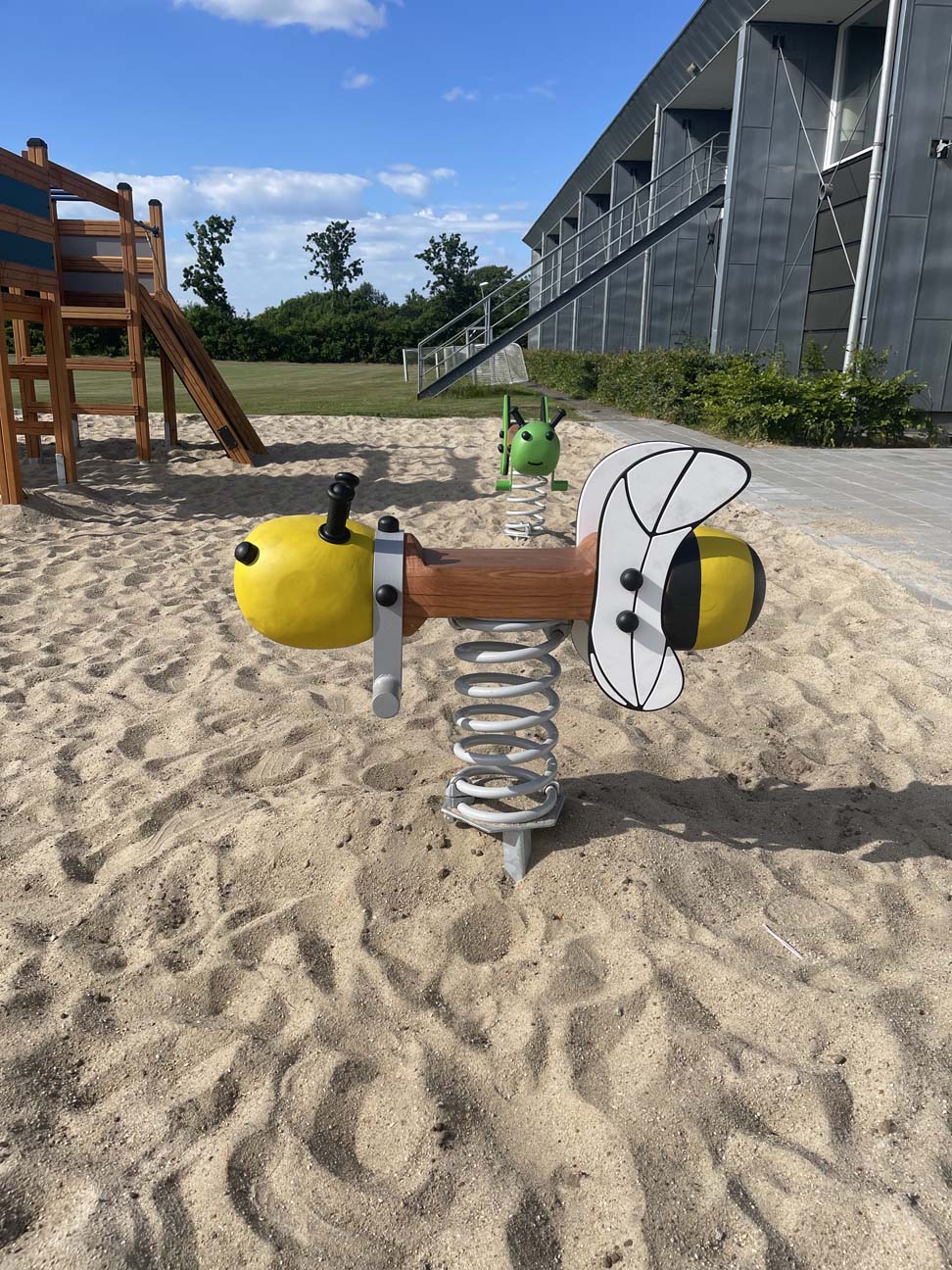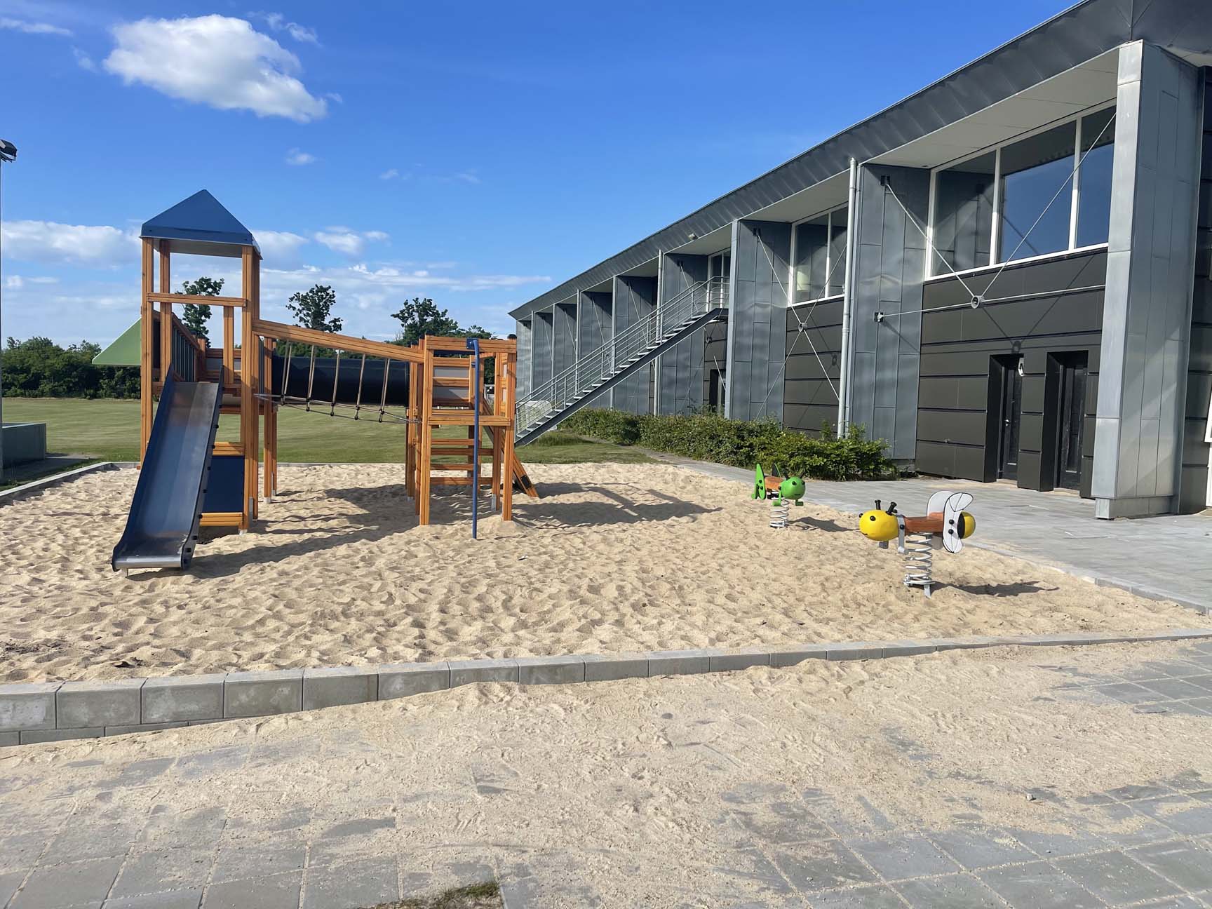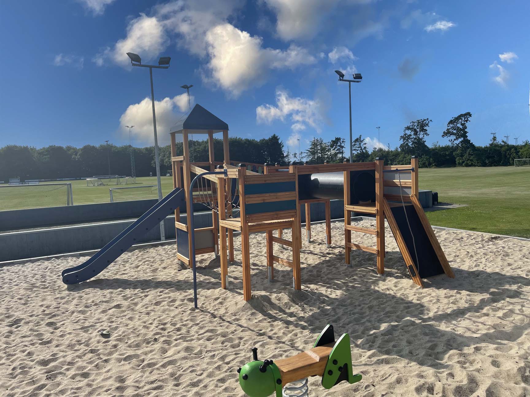 Legepladsen ligger i direkte forbindelse med byens fodboldbane – så nu kan søskende i bogstaveligste forstand lege på sidelinjen, når storebror eller storesøster er til træning eller spiller kamp.