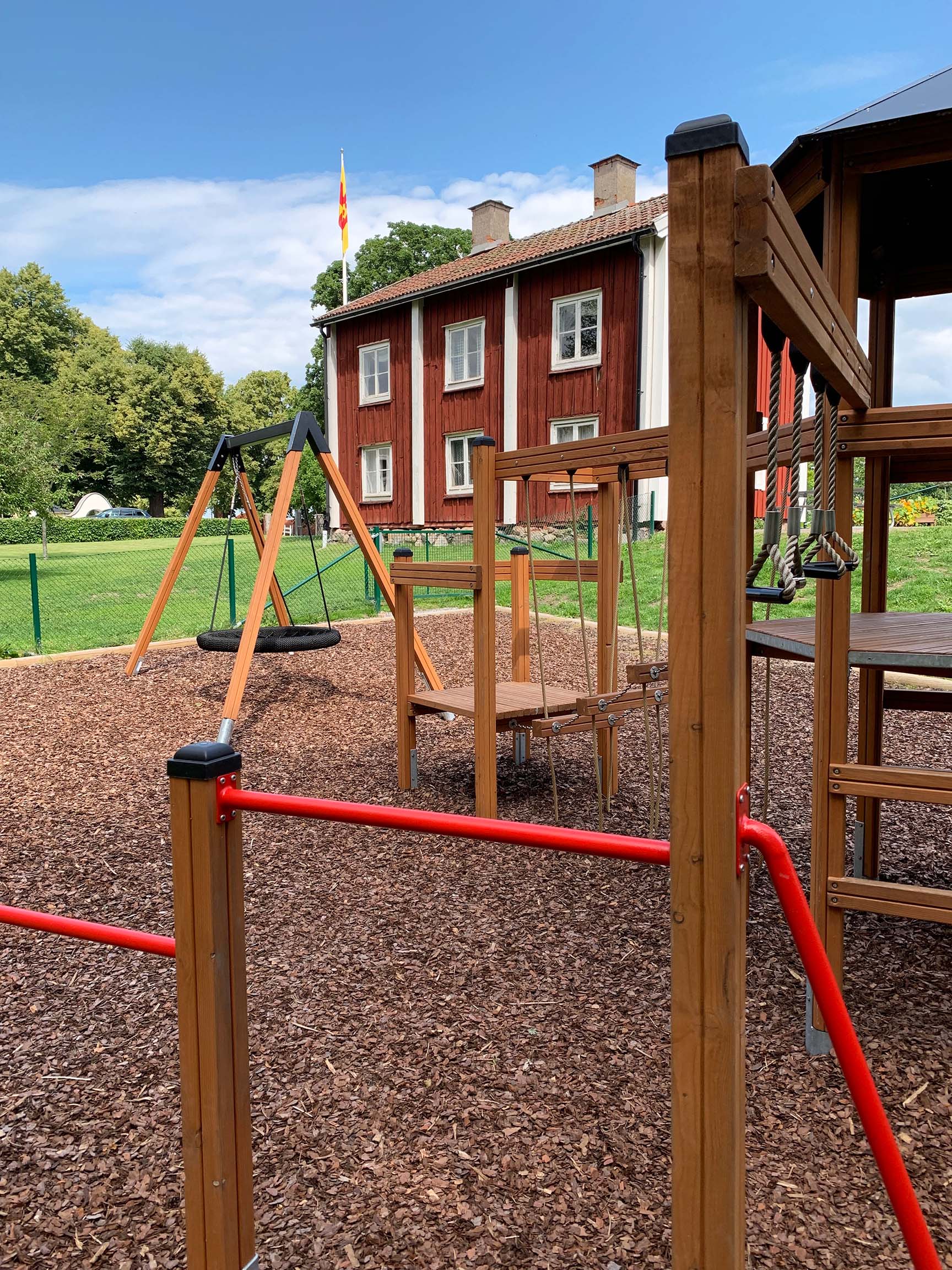 At det hele hænger sammen betød, at der blev sparet plads – og så var der også plads til gyngestativet med fugleredegyngen, som har plads til flere børn.