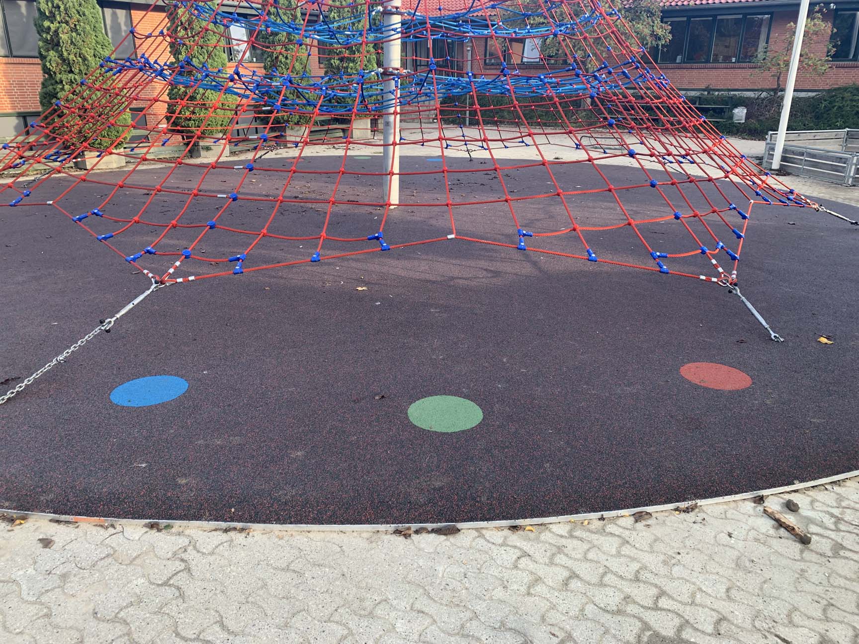 Vi vil – når det er muligt – altid gerne tilpasse farverne i de projekter, vi laver sammen med kunderne. Her er farverne i skolens logo afspejlet i både klatrepyramiden og faldunderlaget, hvilket skaber en stærk visuel sammenhæng.