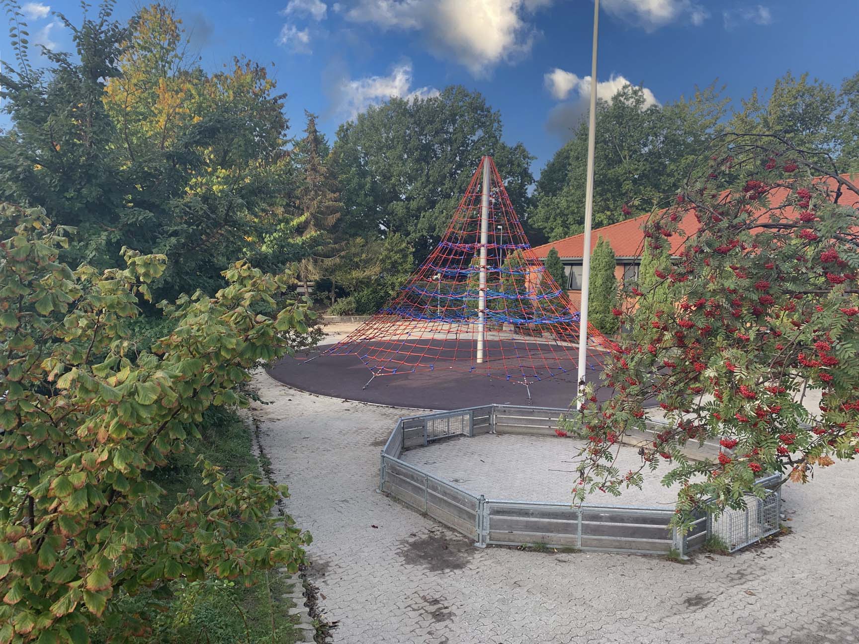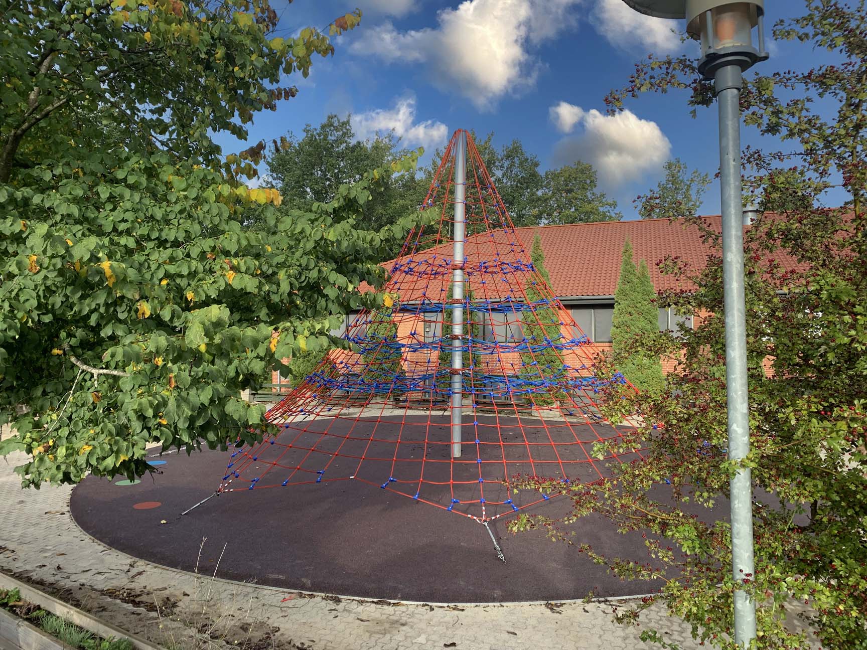 På Thomasskolen i Skovlunde stråler klatrepyramiden Gigantis midt på legepladsen. Klatrepyramiden er hele 7 meter høj og et imponerende syn – og så kan der være rigtigt mange børn på pyramiden på samme tid pga. den store klatreoverflade.