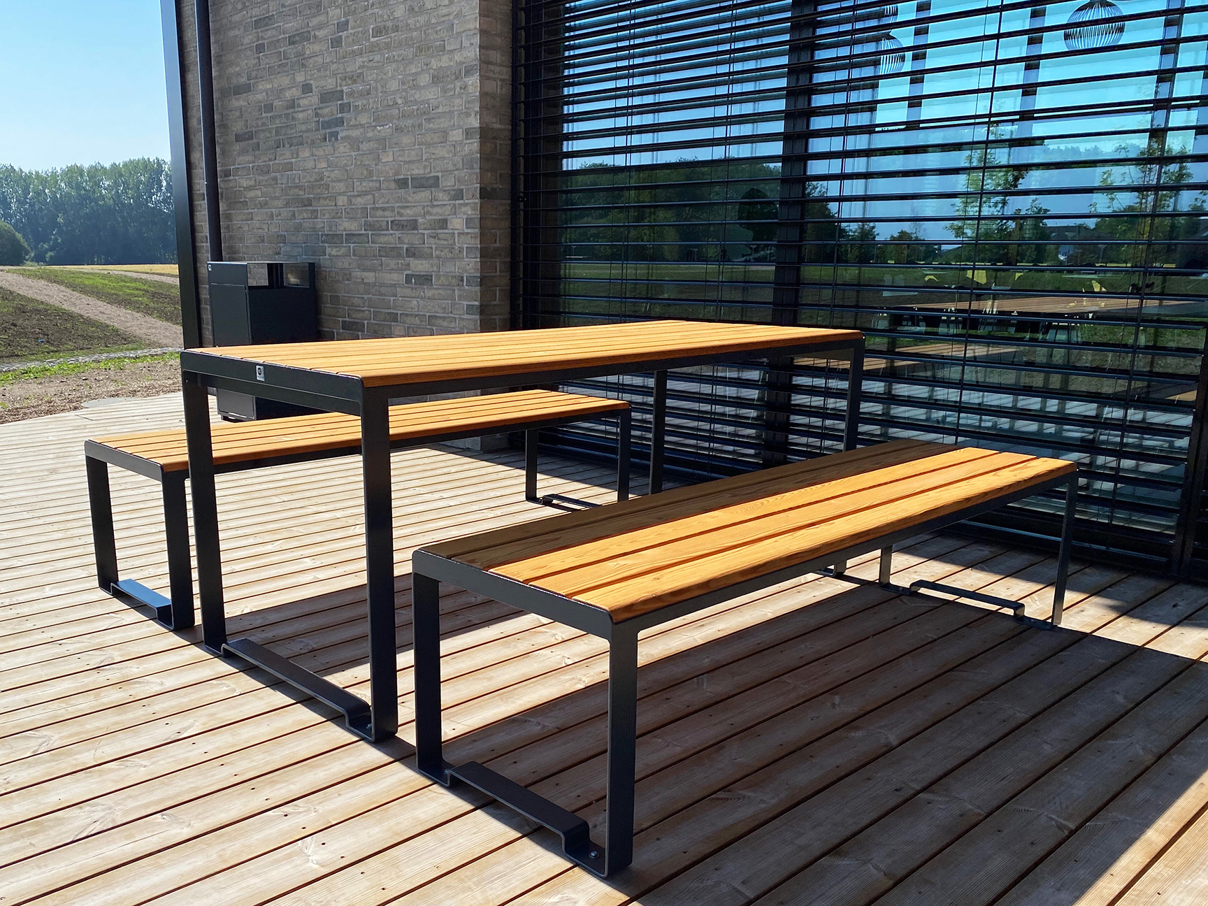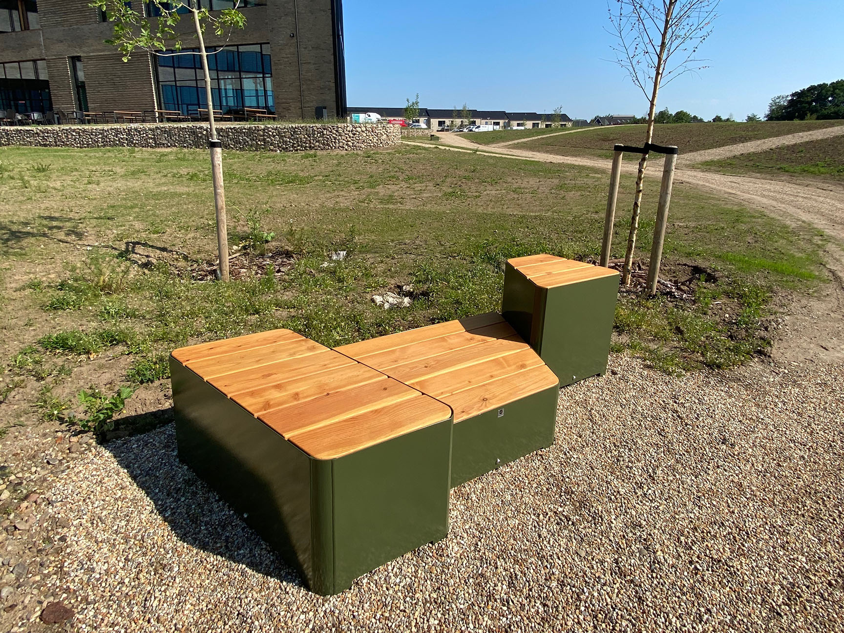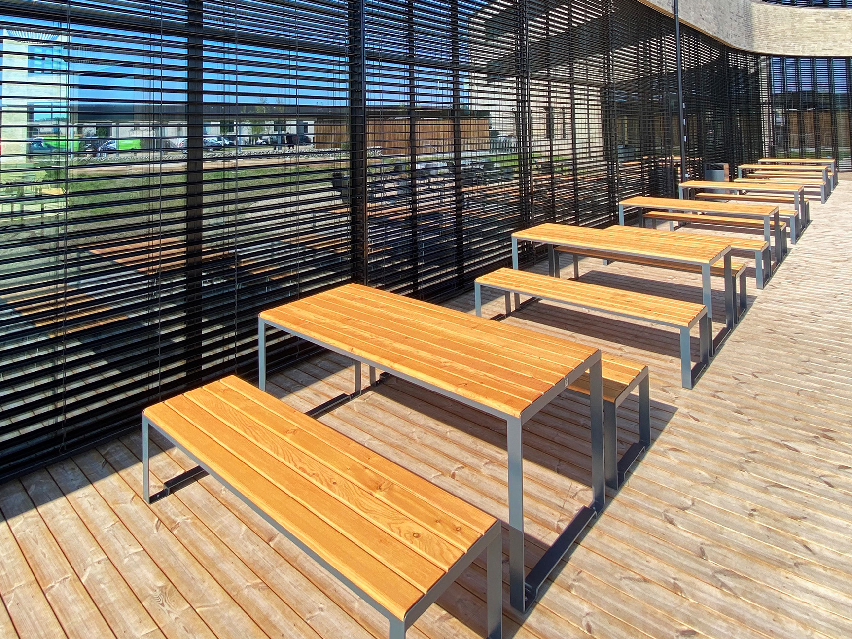 Til DLG’s nye udendørsområder faldt valget på produktfamilien TUCANA, som med sine åbne sider på bænke og borde fremstår lette og luftige ved siden af den store bygning. De kompakte moduler i familien AQUILA blev udvalgt til at skabe små mødesteder langs de omkringliggende stier.