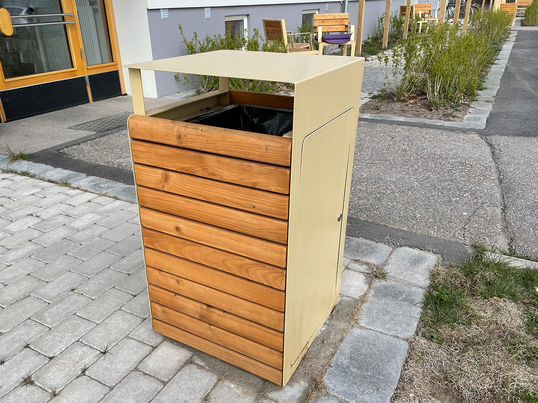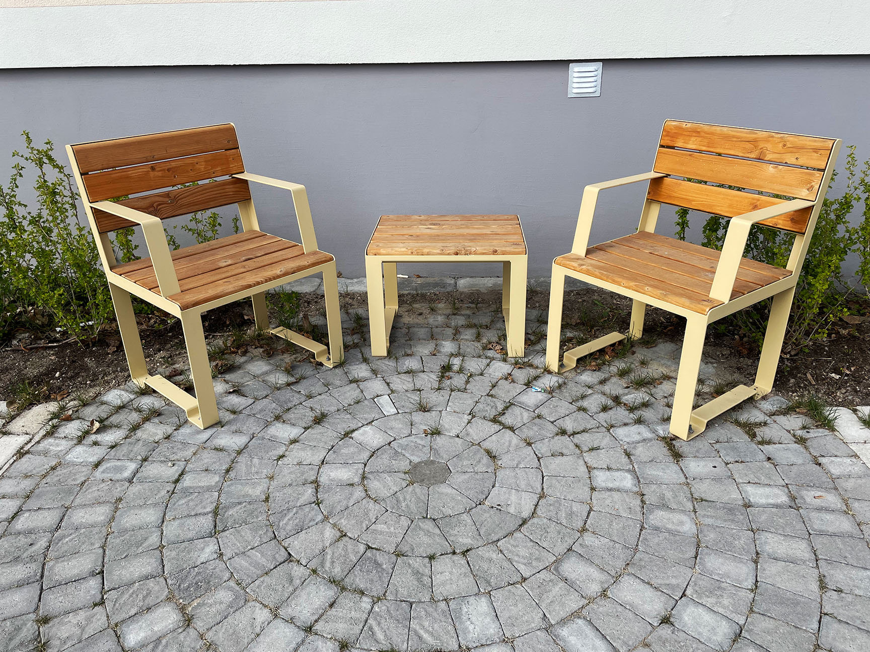 Parkmøblerne er fremstillet af holdbart lærketræ, som harmonerer flot med den nybyggede pergola og planteunderstøtningen, der snart vil blive dækket af smukke klatreplanter. Stålet er pulverlakeret i RAL-farven 1001 Beige, hvilket giver hele gården et lysere og mere frisk udtryk.