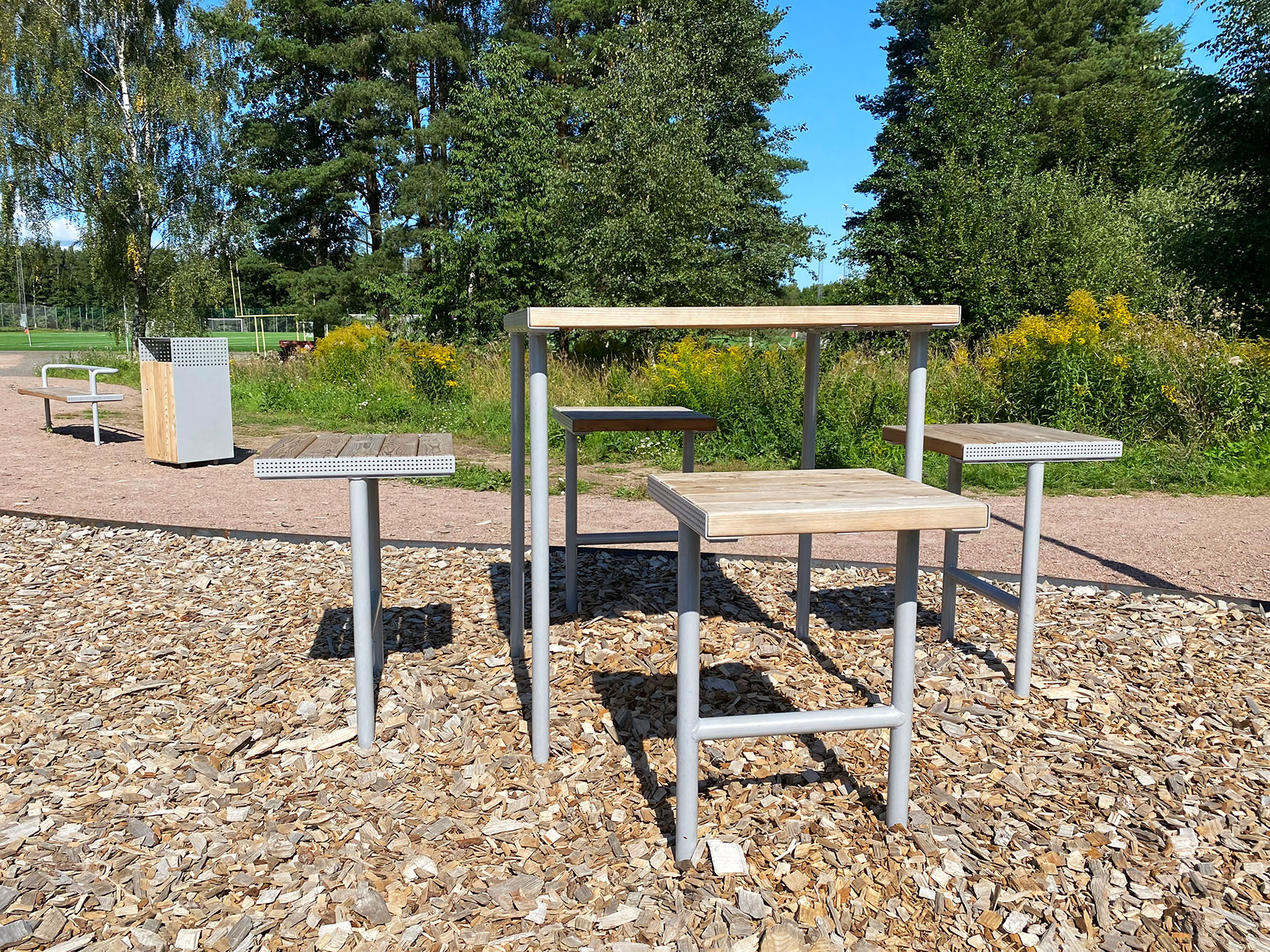 Her kan man som forælder slappe af med en kop kaffe og lidt snacks – og nemt holde øje med børnene, mens de leger. For dem, der bruger fitnessfaciliteterne, er det også værdifuldt at have et sted at stille rygsæk og vandflaske. Desuden giver møblerne en praktisk pauseplads, hvor man kan nyde en forfriskning efter endt træning.