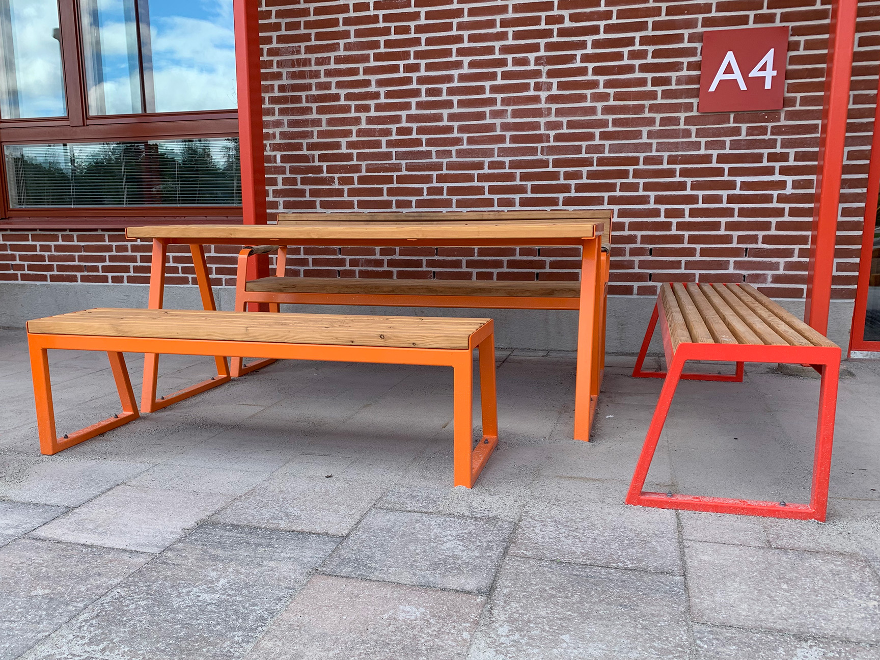 RAL 2003 Pastel orange og RAL 2002 Vermilion, som er den røde nuance, står flot frem mod de grå belægningssten samt græsset og beplantningen i baggrunden. Her kan skolens personale og skolebørnene både nyde en pause og faktisk også holde udendørs undervisning, når vejret tillader det.
