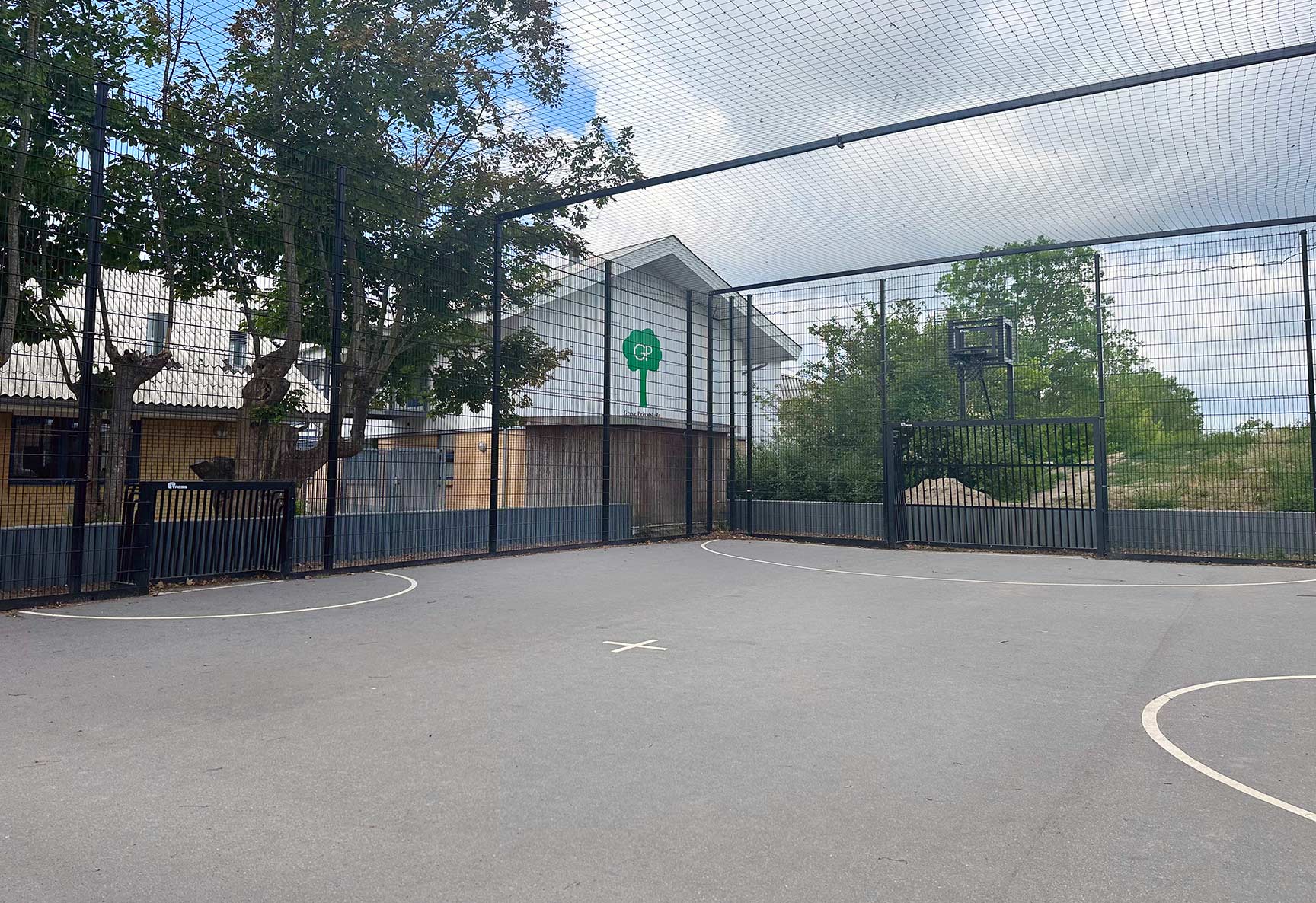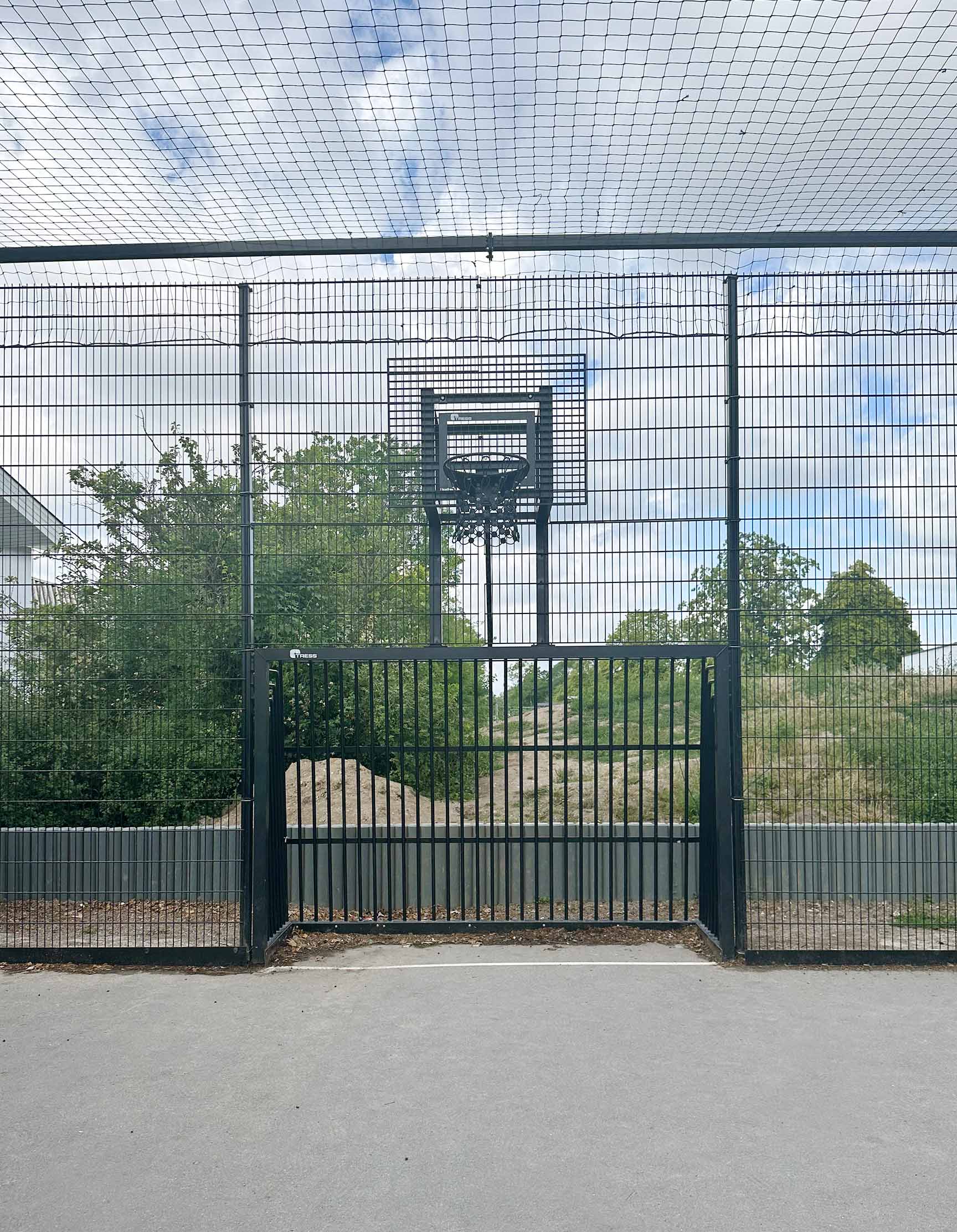 Banen har et net henover toppen – og af hensyn til basketball, valgte vi en løsning med forhøjede, buede spær. Dermed minimeres risikoen for, at nettet kommer til at hænge og genere spillet.
