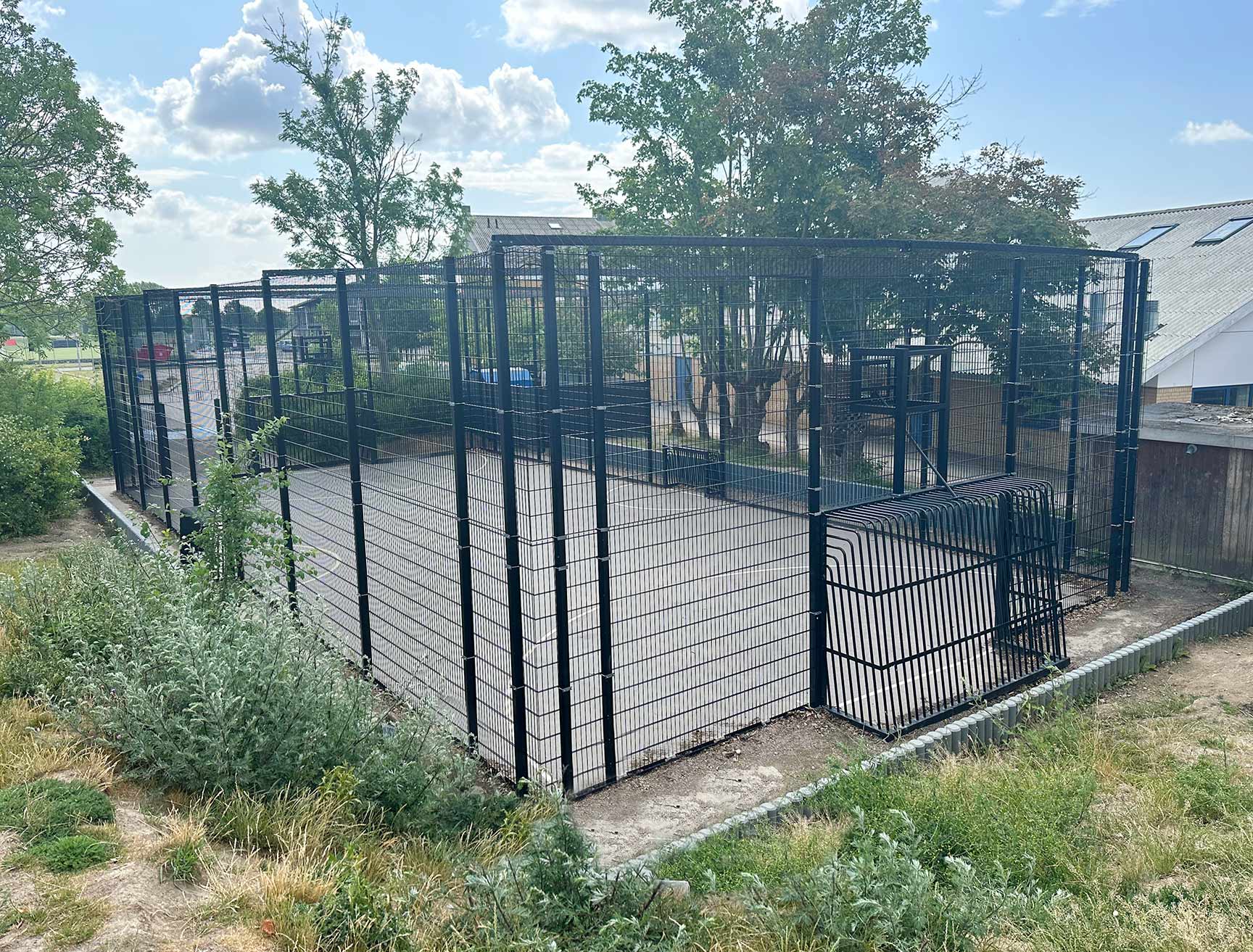Da den nye boldbane skulle placeres ud til parkeringsplads og vej, var det vigtigt for skolen, at minimere risikoen for vildfarne bolde. Derfor faldt valget på en lukket cityarena med høje hegn, som holder boldene på banen.