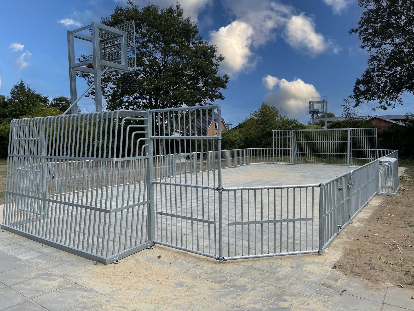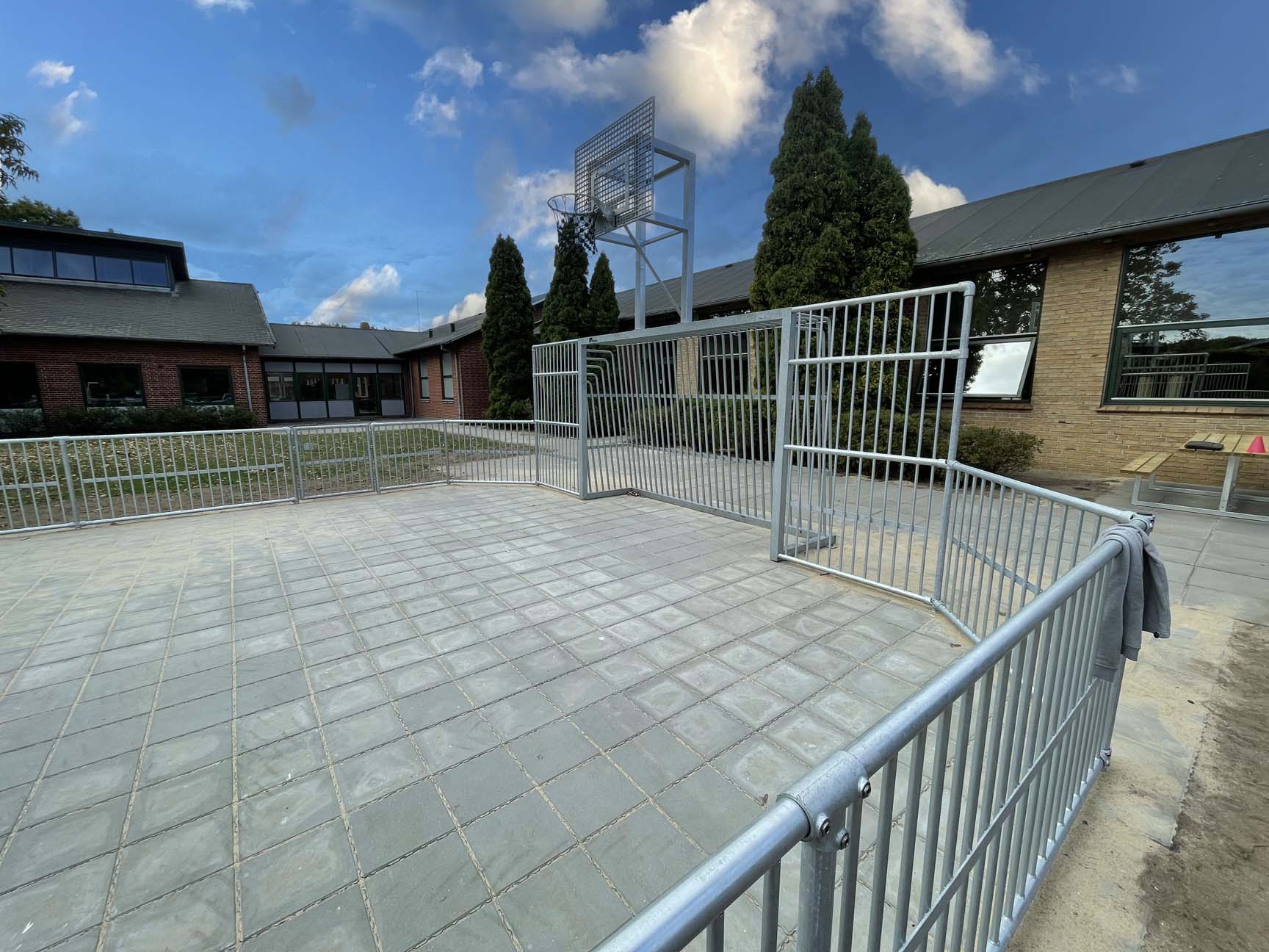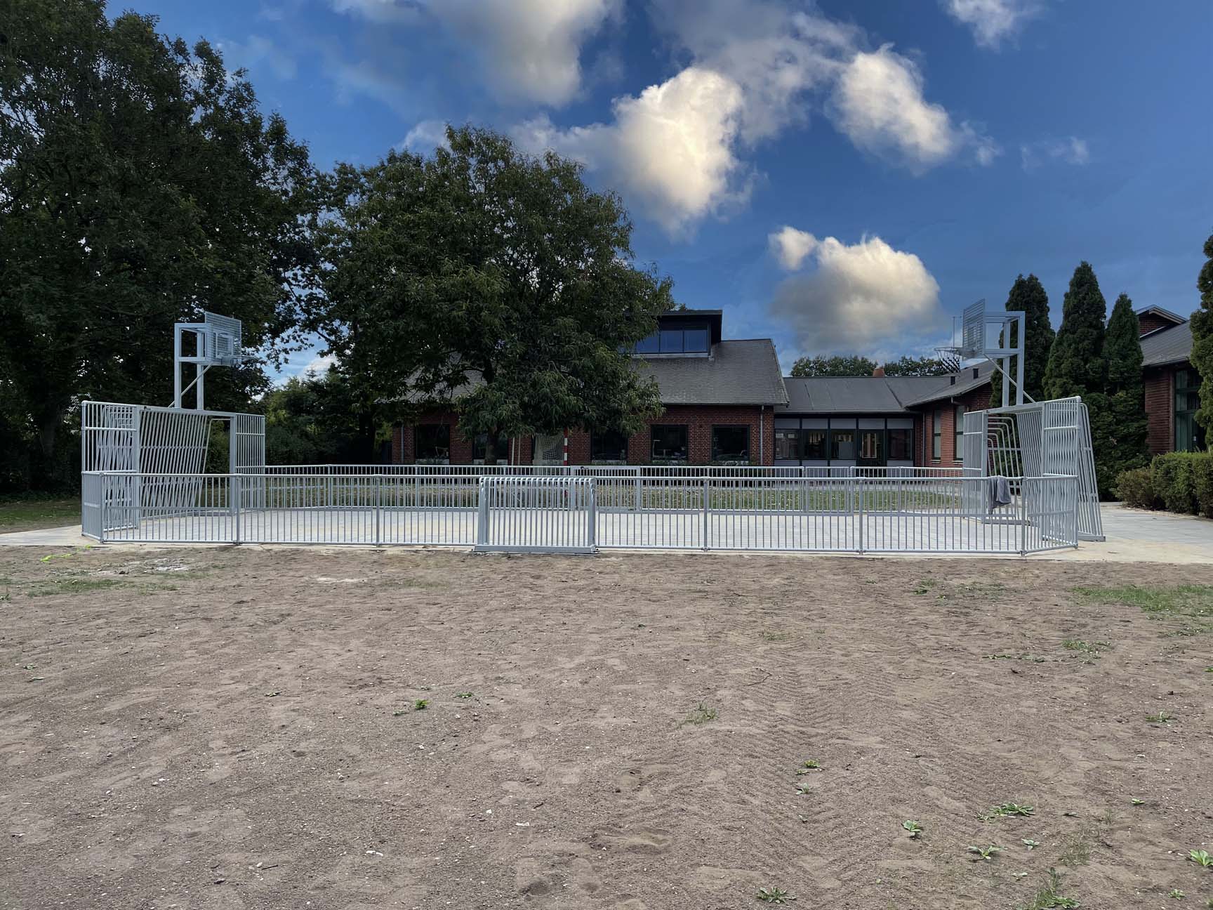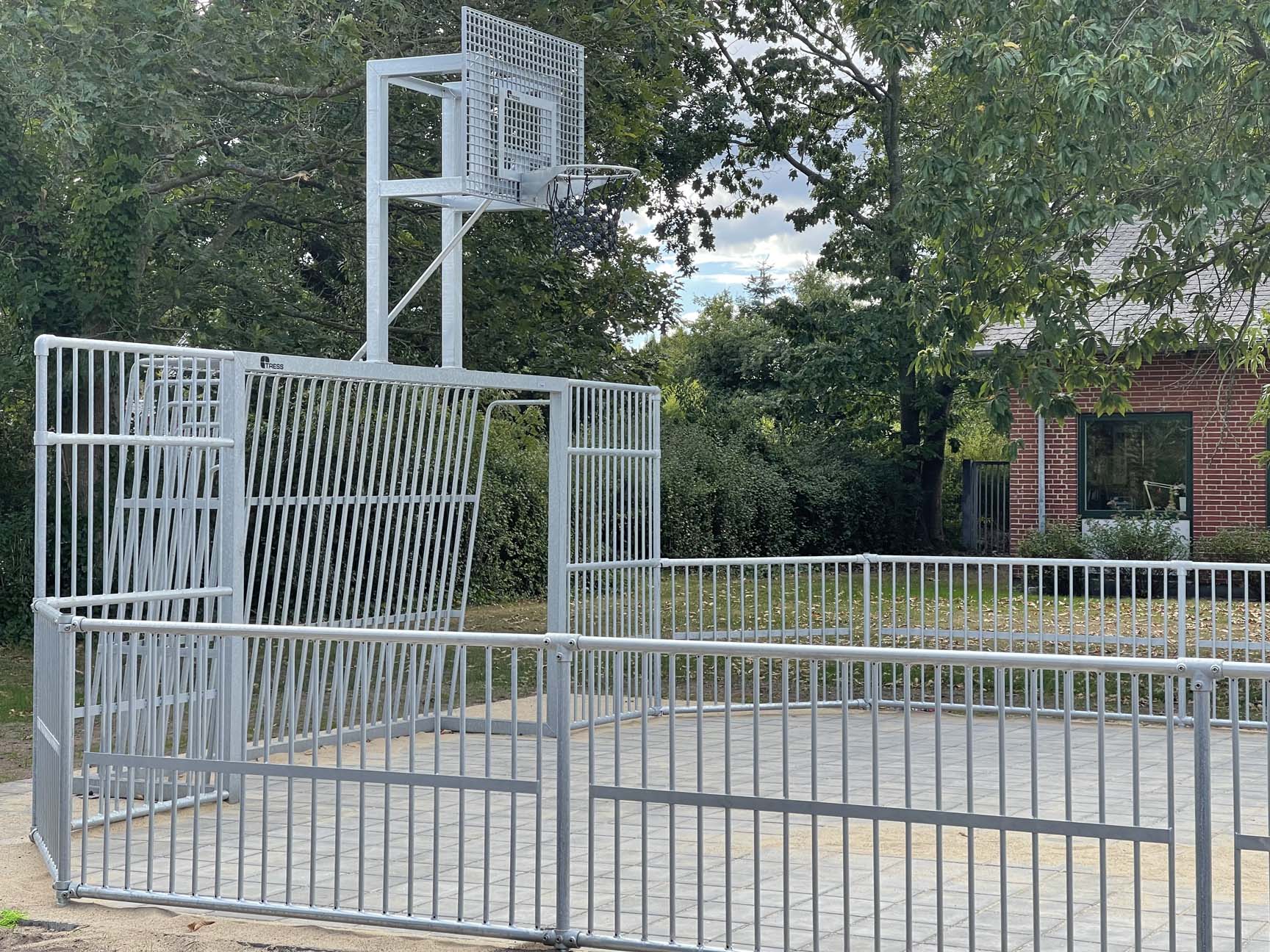 Multibanen er lavet i specialmål, så den kunne passe perfekt til et bart område mellem skolens bygninger. Kunden valgte vores stålmultibane THOR, som har et flot råt udtryk, der samtidig er let at se på.