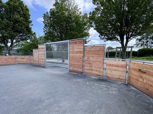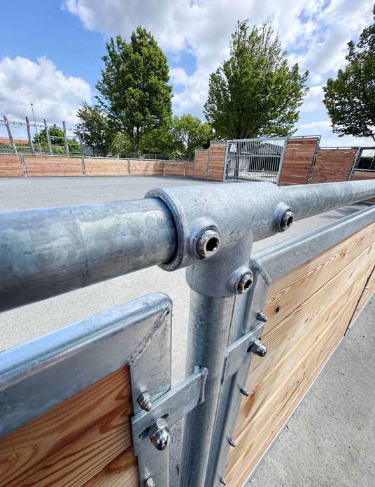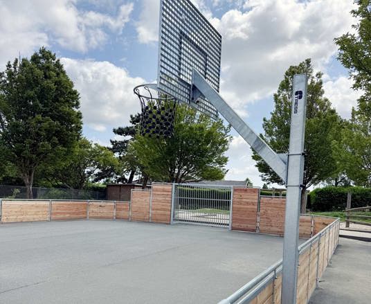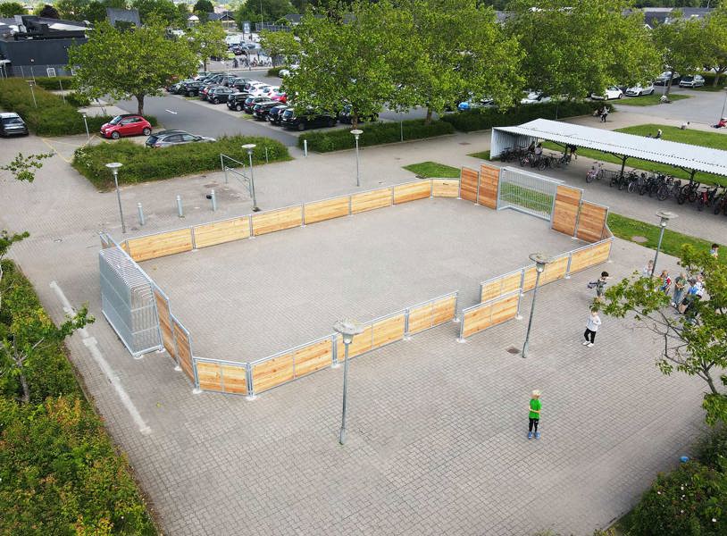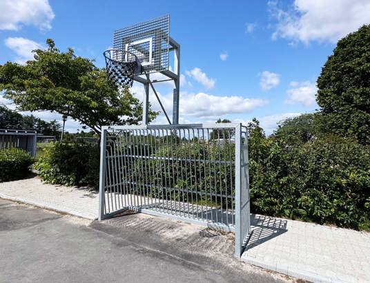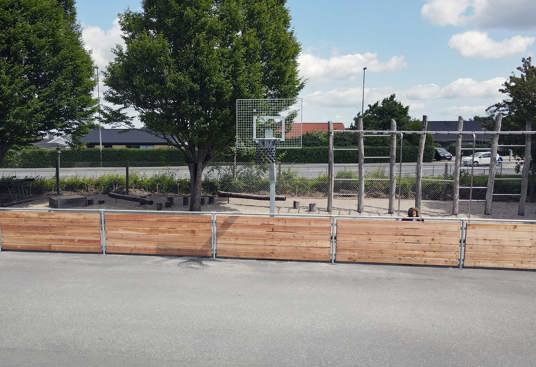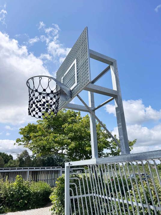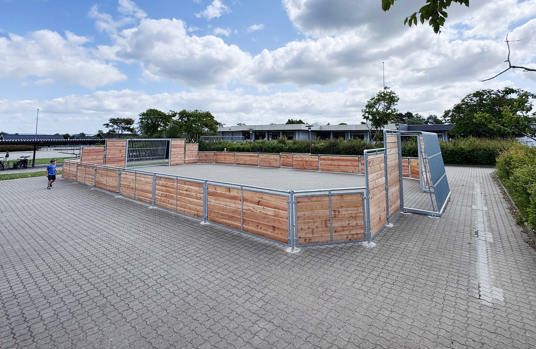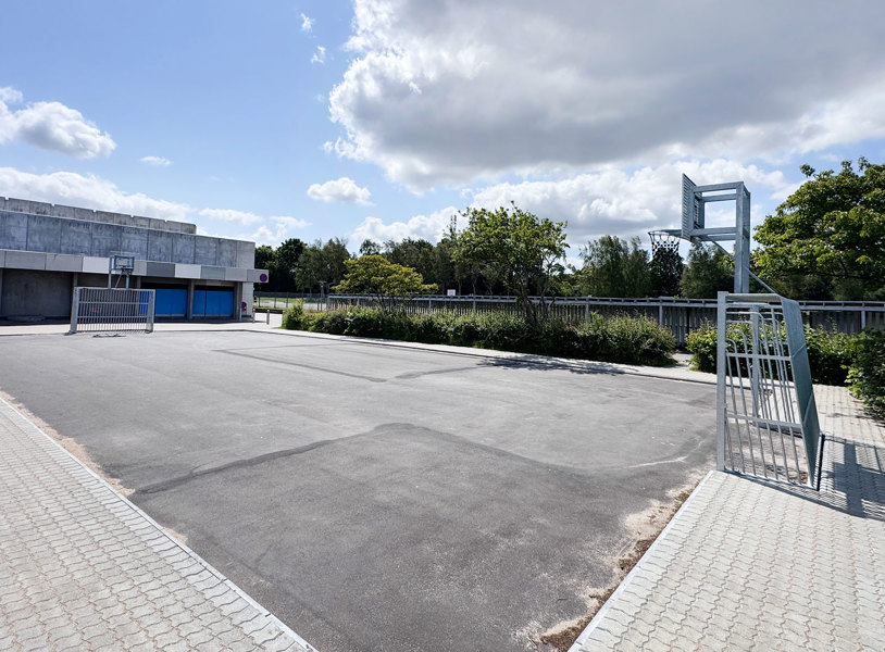 Den første bane er etableret med solidt asfaltunderlag og omkranset af TRESS’ klassiske multibane i lærk. Den robuste konstruktion med galvaniseret stål og lærketræ giver et varmt og naturligt udtryk og sikrer en høj slidstyrke. På tværs af banen er der også Goliath basketballstativer, som tåler intensiv brug og kræver minimal vedligeholdelse.