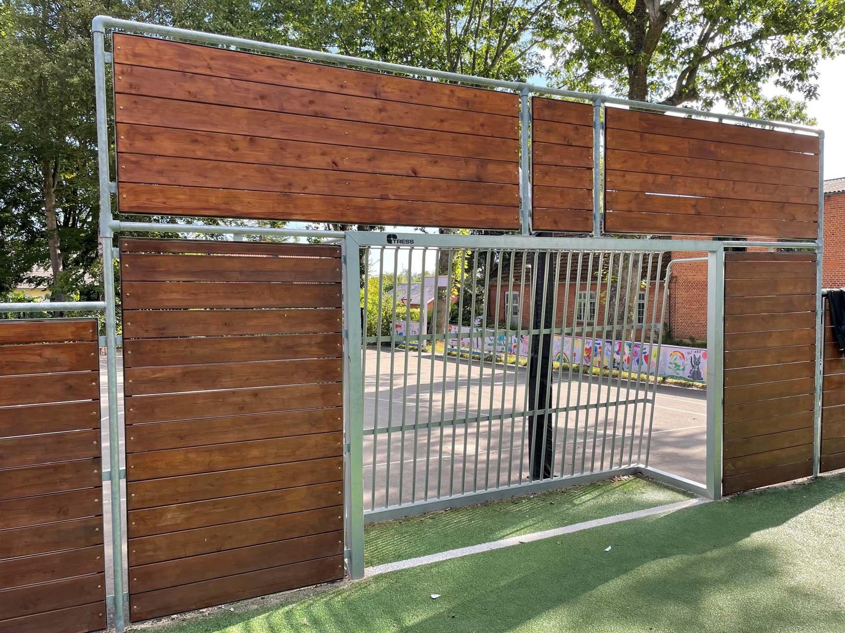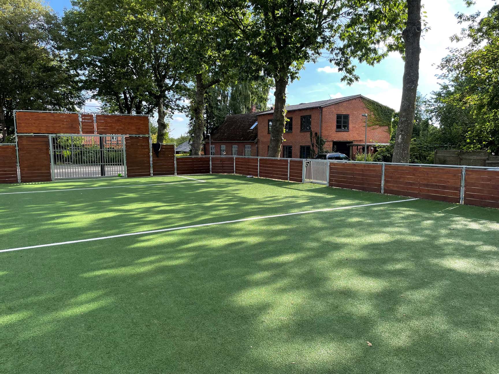 Odder Lille Friskole har nu fået en splinterny multibane med bandemoduler med 1. klasses høvlede lærketræsplanker, som passer smukt til de gamle træer rundt om banen. Banen har fået lagt et underlag i kunstgræs, som gør den ekstra sjov at spille på.