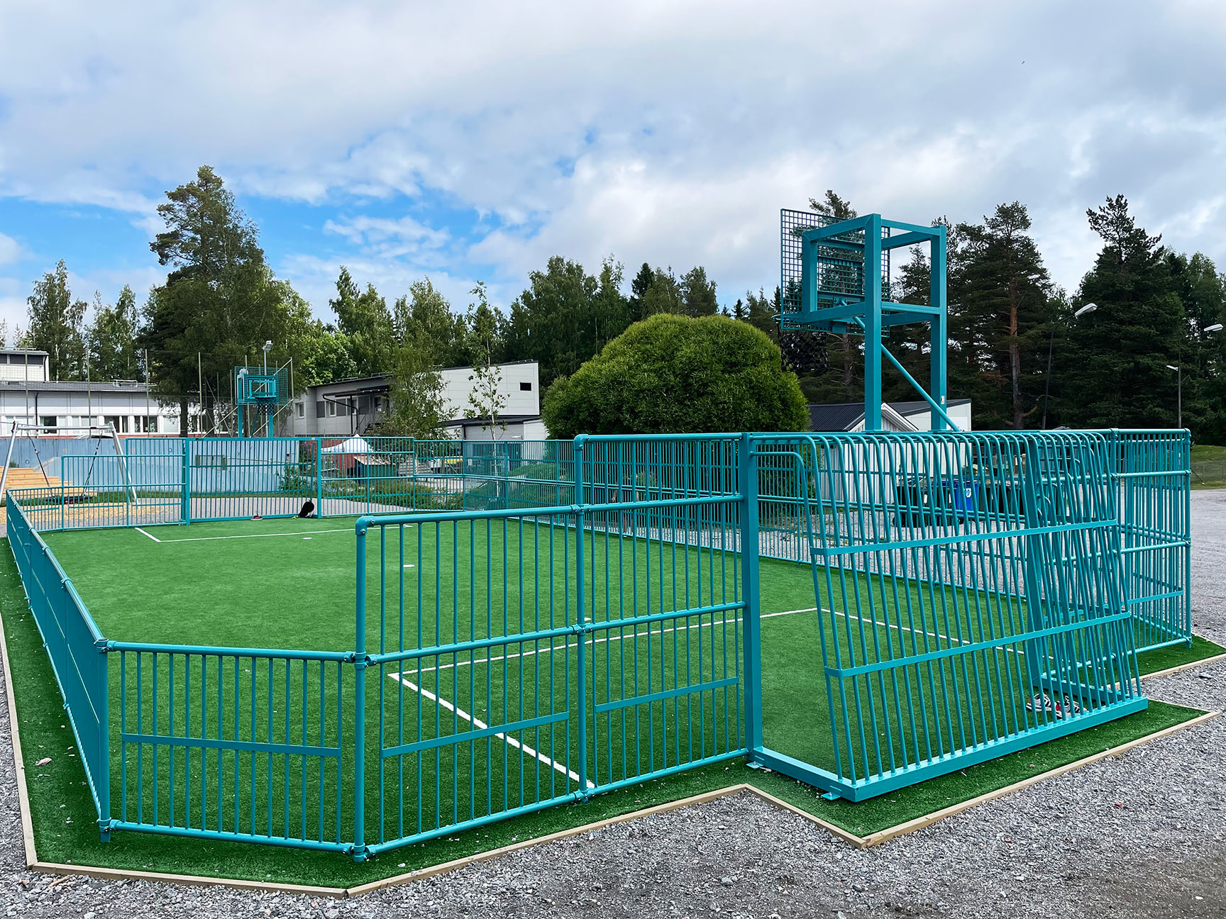 Multiarenaens farver skiller sig ud og lyser op i området. Det grønne kunstgræs står i flot kontrast til den blågrønne multibane og samlet set løfter det skoleområdets samlede udtryk.