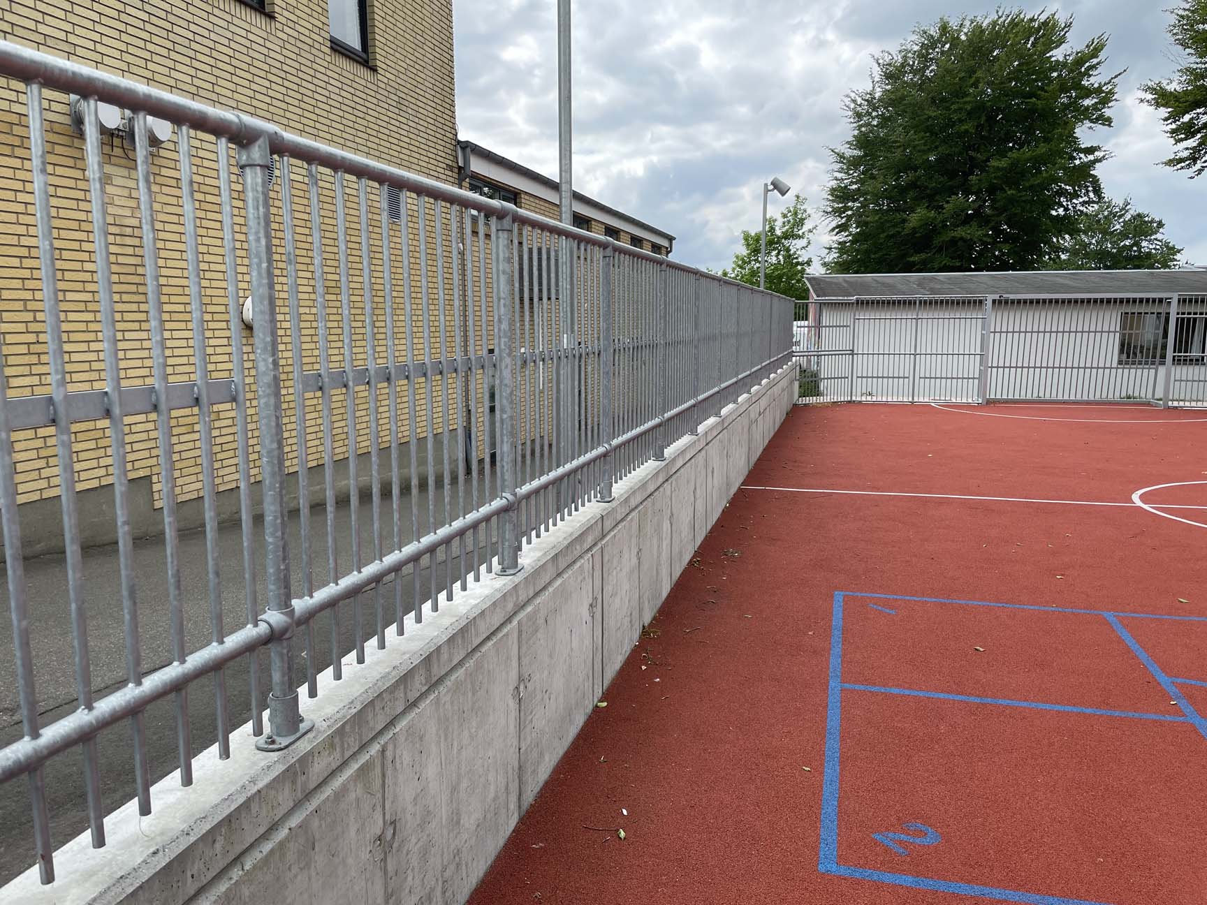 Det var vigtigt for skolen, at multibanen kunne tilpasses skolegårdens terræn og integreres med en støttemur ind mod bygningerne. Den opgave løste vi selvfølgelig uden problemer ved at tilpasse multibanen.