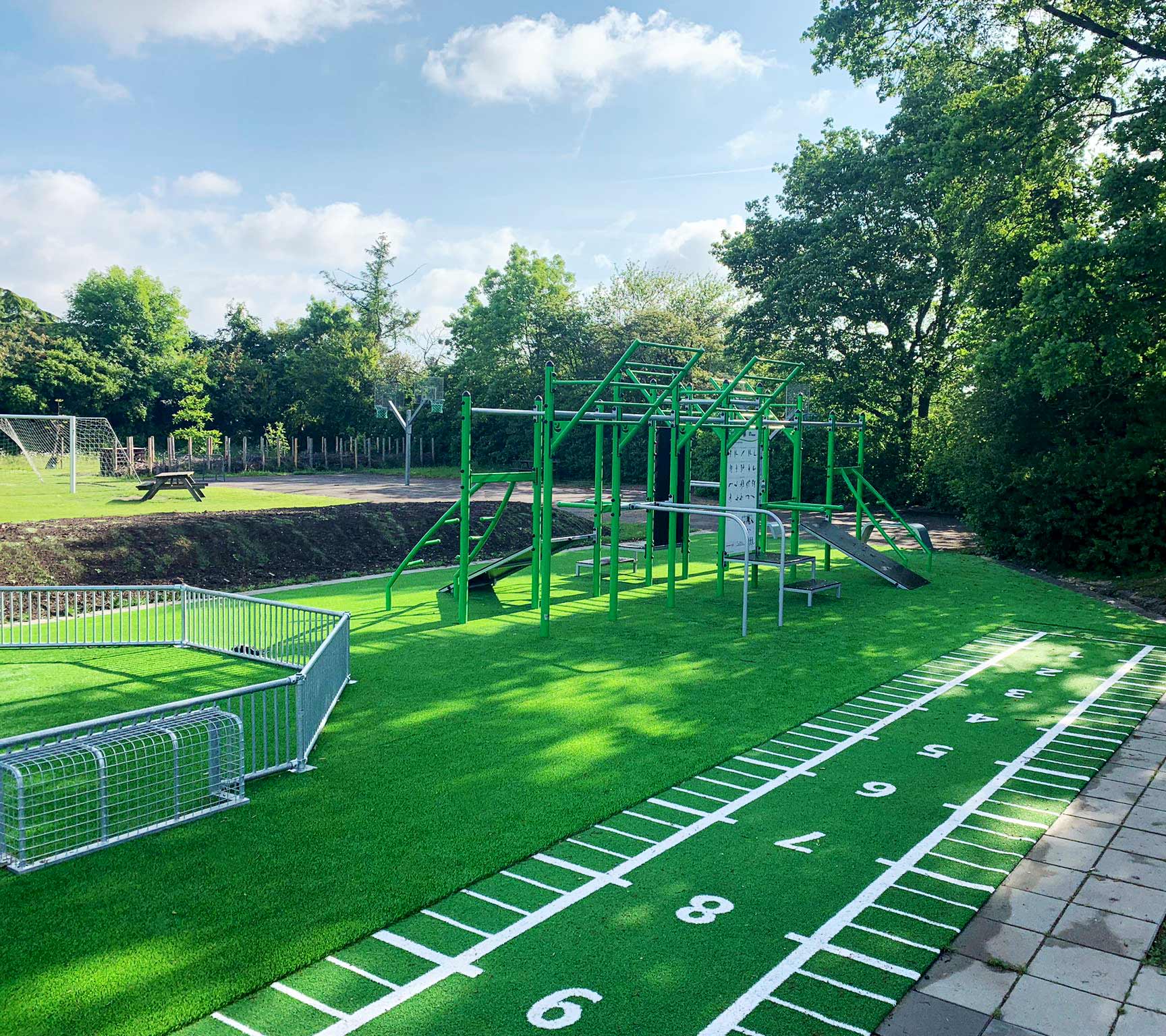 Ved Løjtegårdsskolen i Kastrup ønskede man at udnytte en område ved boldbanerne bag skolen til et aktivitetsområde med plads til udendørs træning og boldspil. Her har vi bl.a. leveret vores populære TRESSfit træningsstativ og en pannabane.