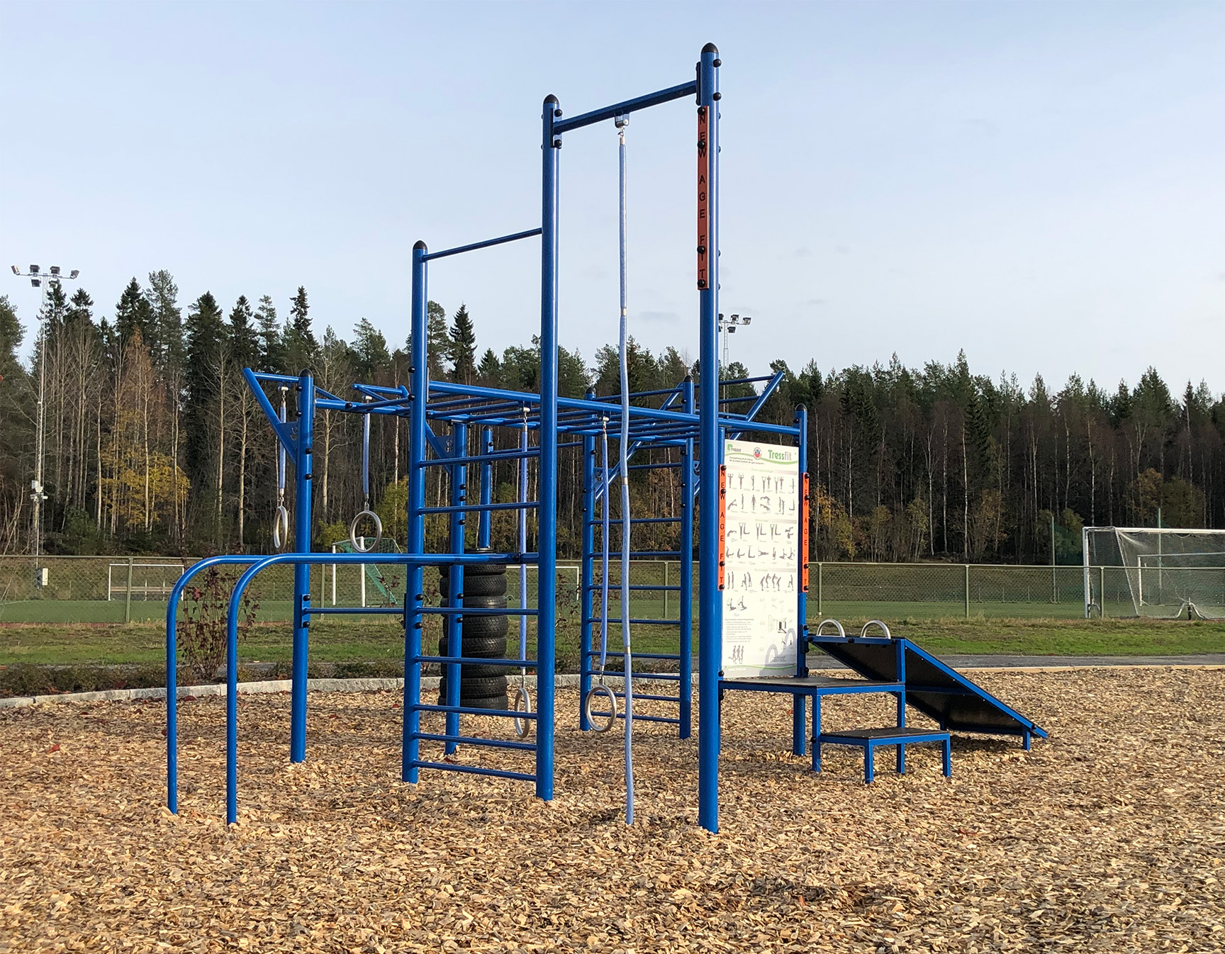 De 10 træningsmaskiner er udstyret med både tag og belysning, hvilket gør, at du kan træne selv i dårligt vejr, og når det er mørkt. Belysningen giver også tryghed for udøveren, da området er godt oplyst. Underlagets gummioverflade giver desuden en stabil følelse, når du træner.