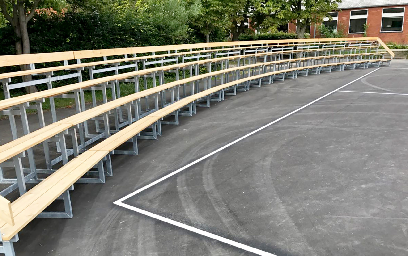 Tribunerne rundt om arenaen blev specialdesignet til skolens behov og areal. De mange siddepladser giver god mulighed for at samle årgangene – og kan fx bruges til udendørs undervisning.