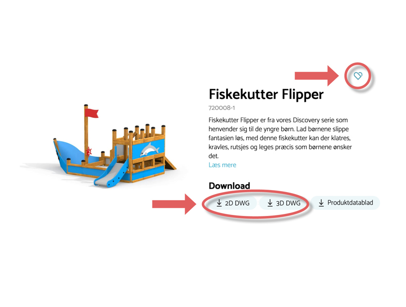 Du kan downloade DWG-filerne med ét klik både fra kategorisiden og på produktsiden. Du kan også downloade et produktdatablad med al info om produktet – og hvis du har et kundelogin, kan du tilføje produktet til dine favoritter ved at klikke på det lille hjerteikon.