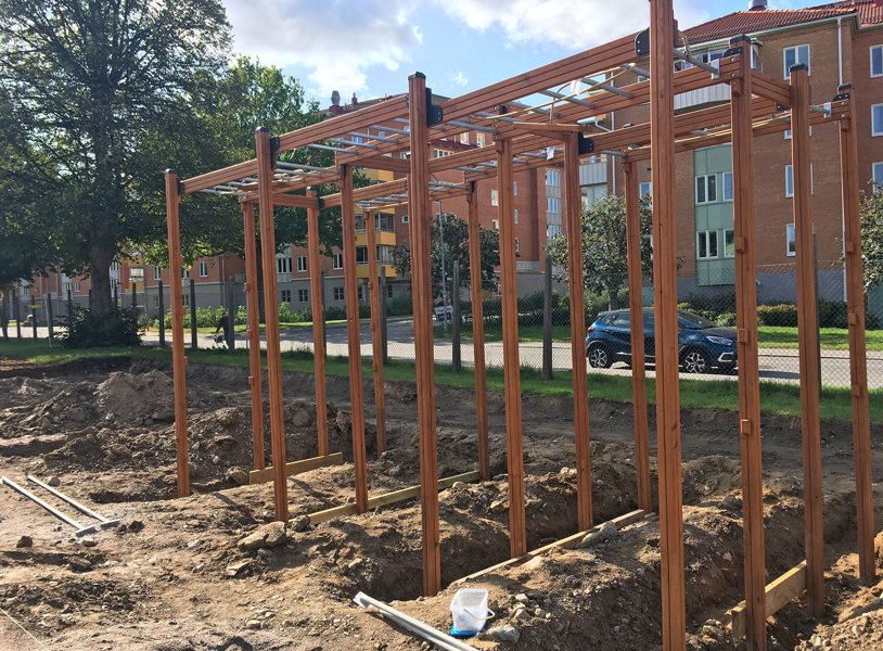 Da størstedelen af vores udendørs træningsanlæg er støbt ned i jorden, skal der i de fleste tilfælde udgraves og bygges et passende faldunderlag. Vi har også træningsstationer og -redskaber, der er specialtilpassede til tag samt fritstående maskiner, der ikke skal forankres.